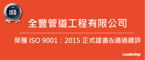 在領導力企管專業顧問輔導下,全豐管道工程有限公司 已順利完成 ISO 9001品質管理系統(ISO 9001:2015 Quality Management Systems)的教育訓練(Training)、系統建置(Implementing)、外部稽核驗證(Certification)3大實施流程,順利取得 ISO 9001 :2015 品質管理系統證書。