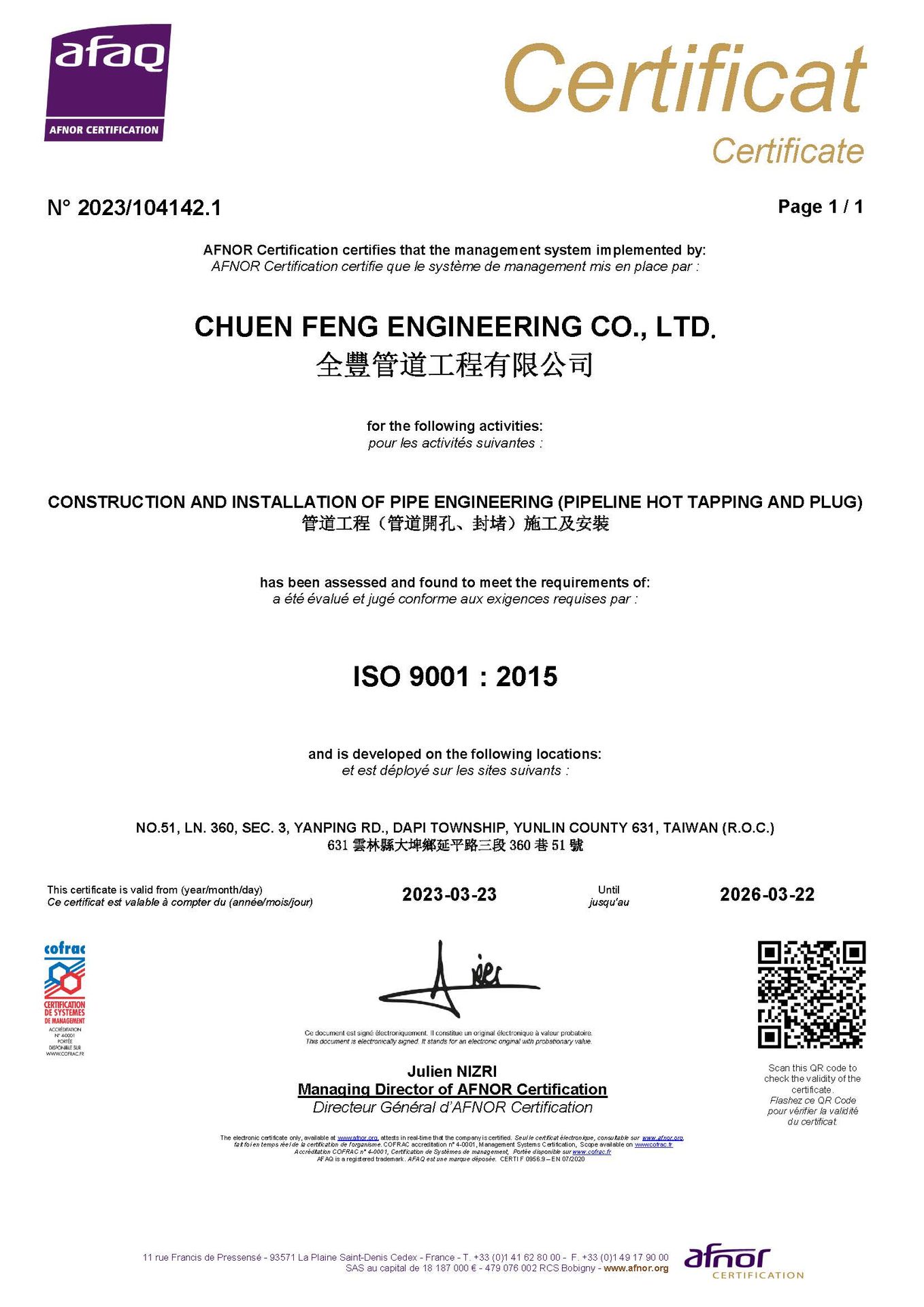 ▲恭喜全豐管道工程取得 ISO 9001:2015 正式證書
