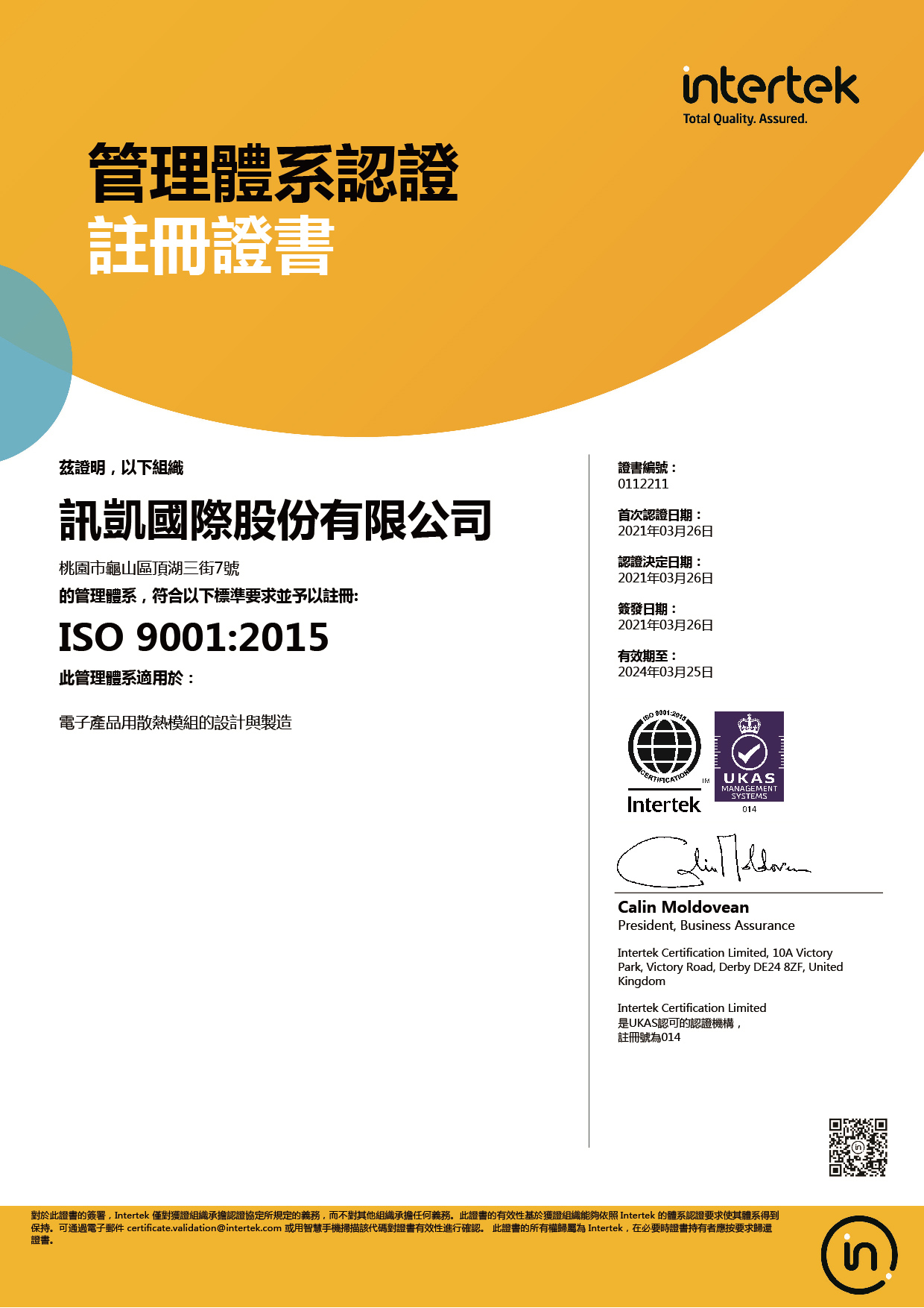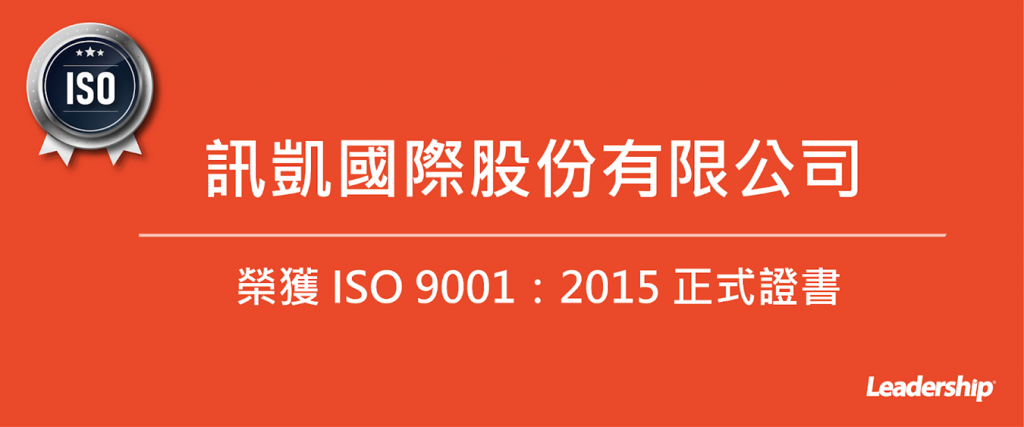 在領導力企管專業顧問輔導下,訊凱國際股份有限公司已順利完成 ISO 9001:2015系統 (ISO 9001 :2015 Quality Management Systems) 教育訓練(Training)、系統建置(Implementing)、外部稽核驗證 (Certification)3大實施流程,順利取得 ISO 9001 :2015證書。