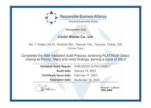 恭喜 Cooler Master 訊凱國際通過 RBA 7.0 VAP 獲得滿分 200 分的好成績!