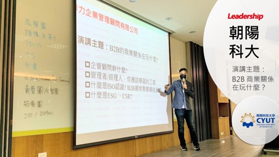 繼上回勤益科大的邀請分享【企業管理很簡單-ISO 9001 遊戲化教學模式】後,領導力企管顧問本次再度榮獲朝陽科技大學(管理學院)副院長林志偉的邀請,讓顧問回娘家與朝陽的大四準新鮮人、EMBA 學生加起來近百人一同分享【B2B 的商業關係在玩什麼?】,並讓這些(EMBA 學生)已經是社會上的經理人、未來的老闆的菁英們分享底下幾個主題,與同學們勉勵: