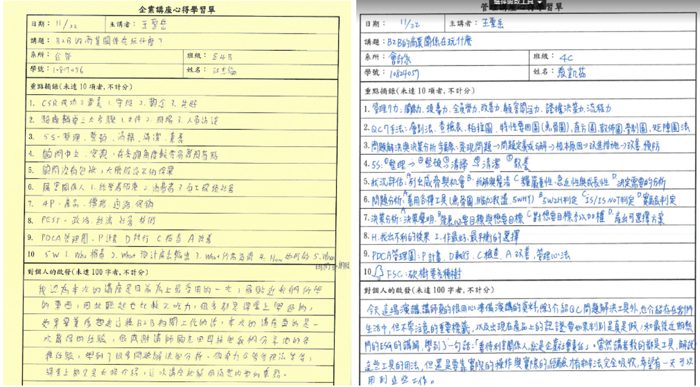 ▲ 企管系江同學表示 (左) 本次講座是目前上過最受用的一堂課,超過上百則的學員回饋評價 >> 請點我看