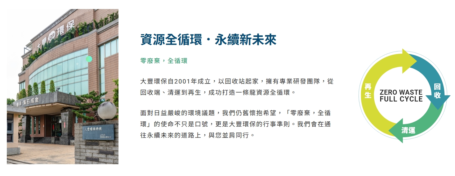大豐環保科技股份有限公司長期致力於全球資源循環管理,透過專業的資源分類知識、高效的回收通路系統,並持續研發再利用與再製造技術,推動低碳循環經濟的落實。秉持「零廢棄、全循環」的核心經營理念,公司積極減少碳足跡,並在廢棄物清運服務中貫徹環保責任,確保從原料取得、運輸服務到廢棄處理的三大生命週期階段皆符合永續發展目標。