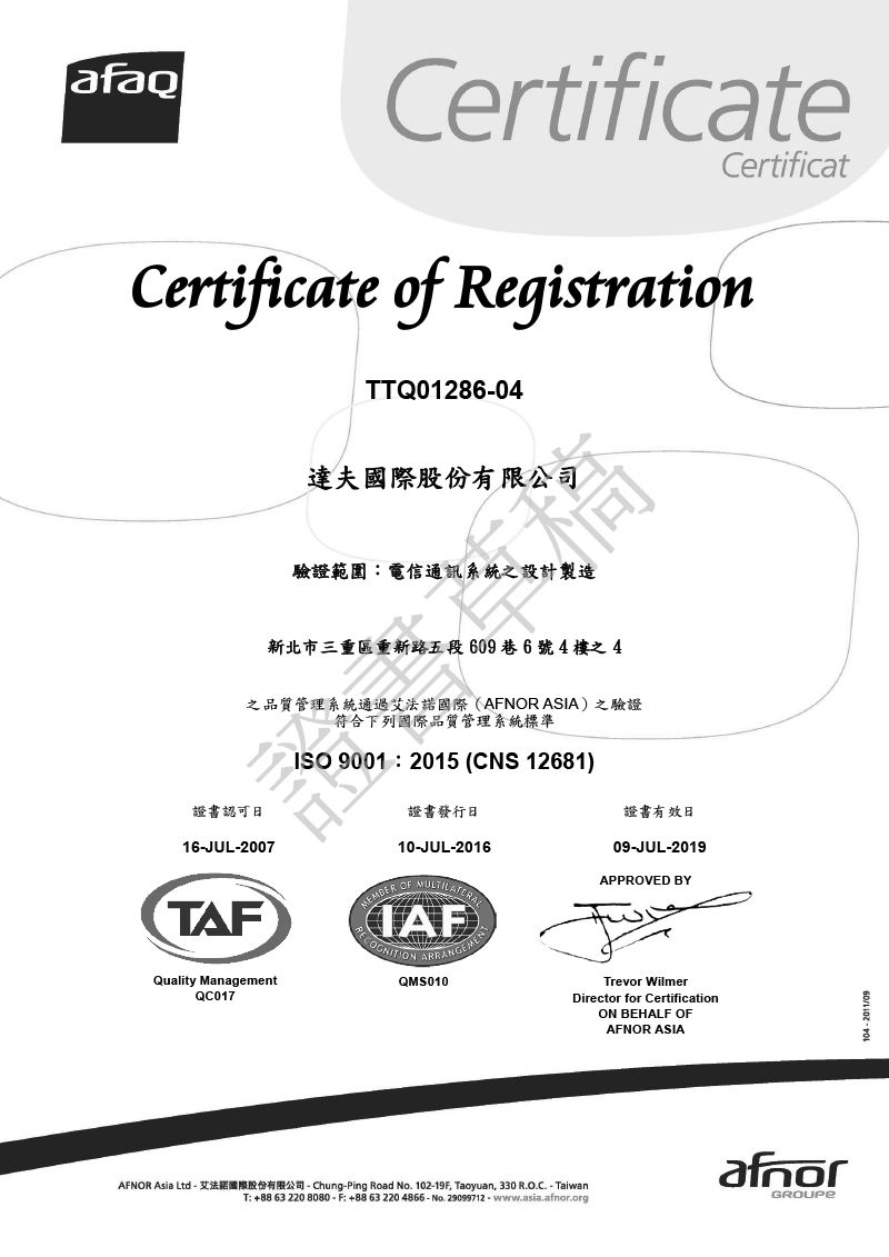 在領導力企管專業顧問輔導下,達夫國際有限公司已順利完成 ISO 9001:2015 品質管理系統(ISO 9001:2015 Quality Management Systems) 教育訓練(Training)、系統建置(Implementing)、外部稽核驗證 (Certification)3大實施流程,並且榮獲 AFNOR 頒發 ISO 9001:2015 品質管理系統新版證書。達夫國際有限公司成立於1979年,主要生產銷售工業用廣播對講系統,自1989年在台灣自行開發研製工業用高聲電話廣播對講系統,行銷到世界各地的煉油廠,發電廠,鋼鐵廠,石化廠,紙廠等,提供一系列的週邊產品,以滿足客戶需求。產品先後通過了美國UL、加拿大CSA防爆認證、中國IECEx GB及台灣CNS國家防爆認證合格。客戶群遍及美國、澳大利亞、中國、日本、韓國、泰國、新加坡、印度尼西亞、越南、蘇丹、阿拉伯大公國等地區。達夫公司除致力該項產品的製造,更以提昇品質與服務為最高指導原則,深信客戶的滿意是公司最大的資產,因此,為確保達夫國際產品能滿足客戶需求,特別規劃健全的品質系統,採用先進儀器設備,運用標準化作業程序執行製程管制,以有效掌控生產狀況。