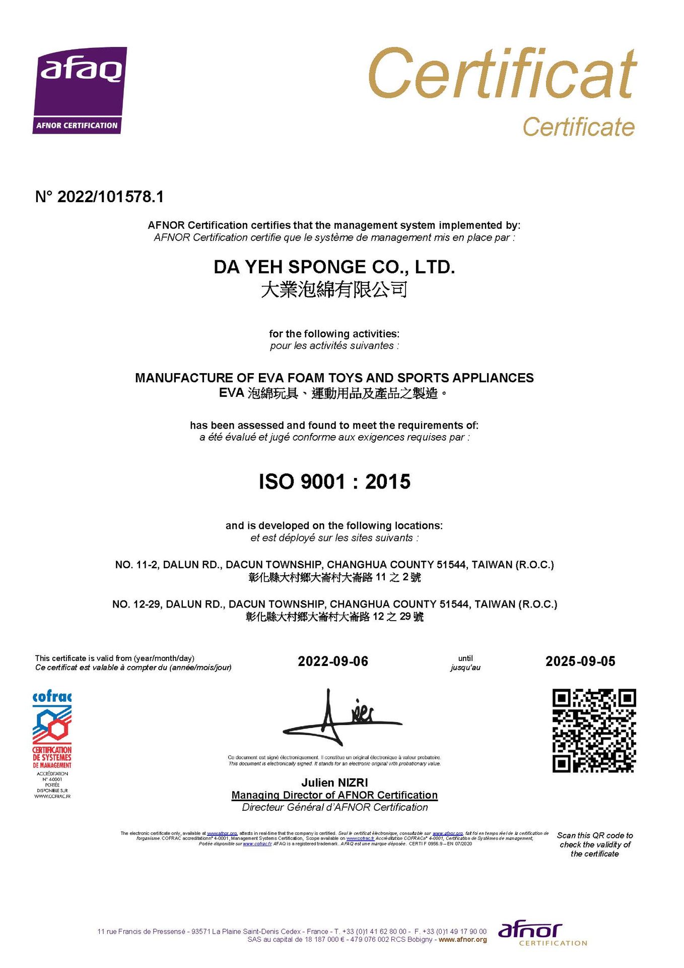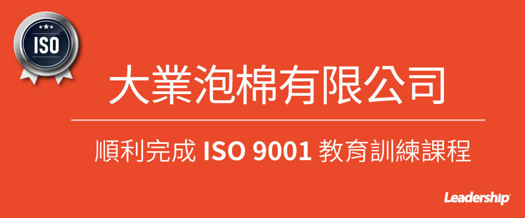 在領導力企管專業顧問輔導下,大業泡綿有限公司 已順利完成 ISO 9001 :2015 系統(ISO 9001 :2015 Quality Management Systems)教育訓練(Training)、系統建置(Implementing)、外部稽核驗證(Certification)3大實施流程,順利取得 ISO 9001:2015 證書。