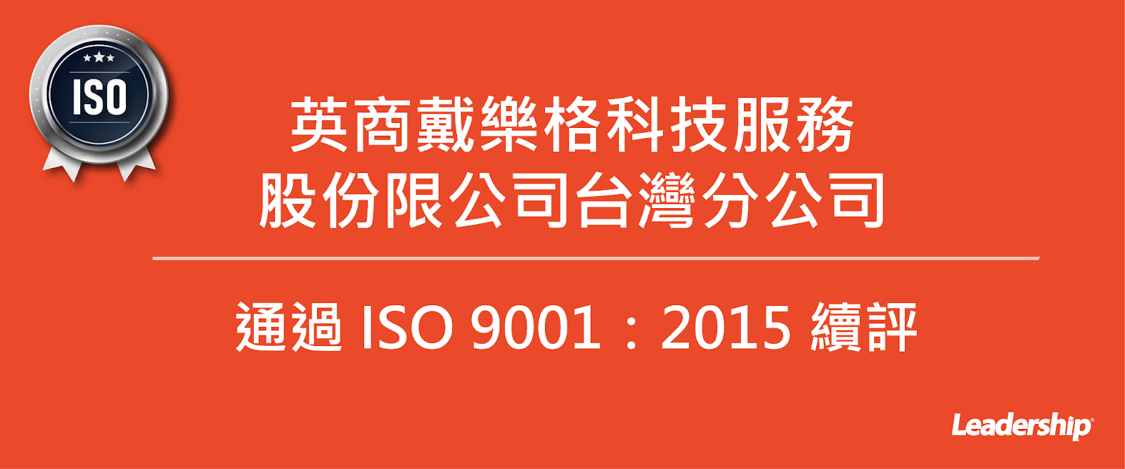 在領導力企管專業顧問輔導下,英商戴樂格科技服務股份限公司台灣分公司已順利通過 ISO 9001:2015系統(ISO 9001:2015 Quality Management Systems)續評。