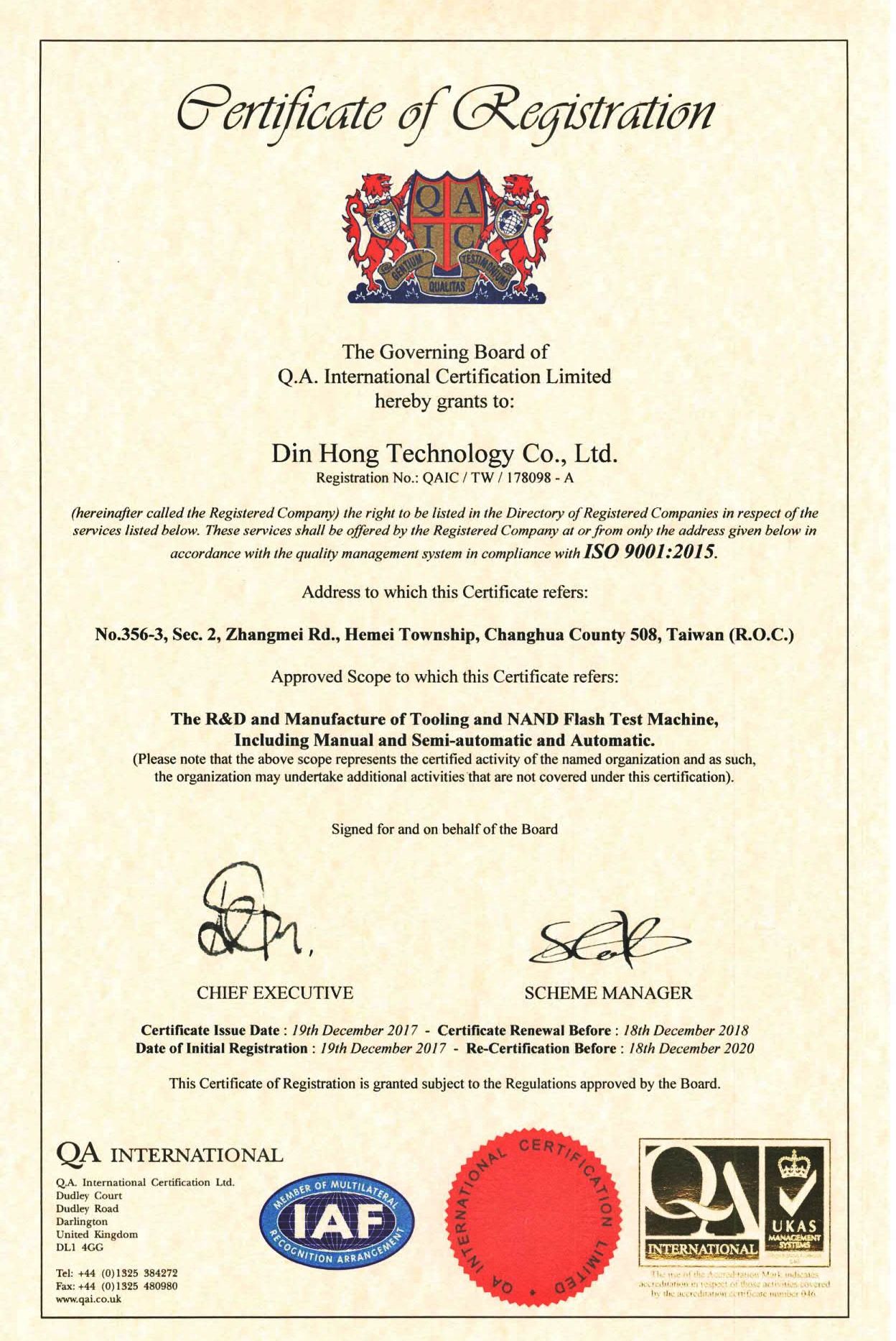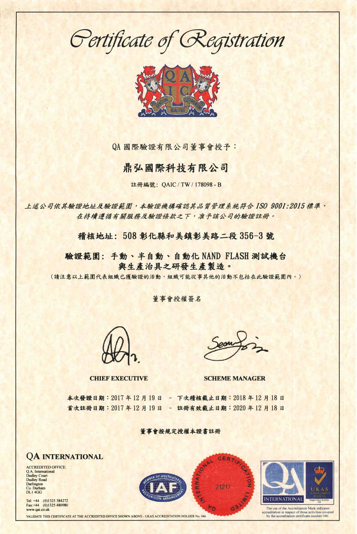 在領導力企管專業顧問輔導下,鼎弘國際科技有限公司已順利完成 ISO 9001:2015 品質管理系統(ISO 9001:2015 Quality Management Systems)教育訓練(Training)、系統建置(Implementing)、外部稽核驗證 (Certification)3大實施流程,獲頒QA頒發 ISO 9001:2015 品質管理系統證書。