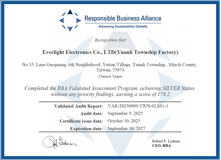 2025年億光電子選擇與領導力企管合作推行RBA,並於苑裡廠以最新版本 RBA VAP 8.0.2 執行輔導、訓練與模擬稽核活動,以進一步提升ESG/RBA的執行成效。
