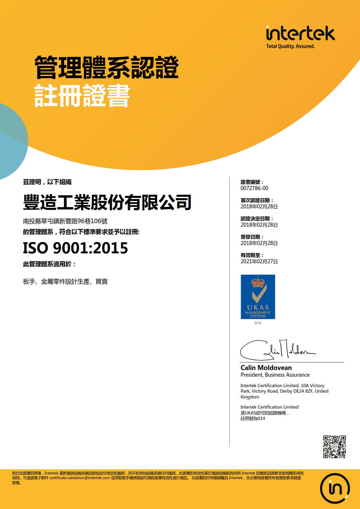 在領導力企管專業顧問輔導下,豐造工業股份有限公司已順利完成 ISO 9001:2015 品質管理系統(ISO 9001:2015 Quality Management Systems)教育訓練(Training)、系統建置(Implementing)、外部稽核驗證 (Certification)3大實施流程,並且榮獲 INTERTEK 頒發 ISO 9001:2015 品質管理系統新版證書。