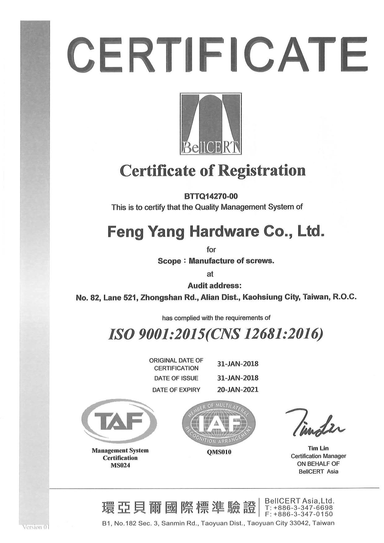 在領導力企管專業顧問輔導下,鋒陽企業有限公司已順利完成 ISO 9001:2015 品質管理系統(ISO 9001:2015 Quality Management Systems)教育訓練(Training)、系統建置(Implementing)、外部稽核驗證 (Certification)3大實施流程,並且榮獲 AFNOR頒發 ISO 9001:2015 品質管理系統新版證書。