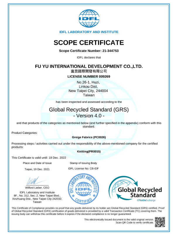 在領導力企管專業顧問輔導下,富昱國際開發有限公司 已順利完成 GRS全球回收標準 ( Global Recycled Standard ) 的教育訓練(Training)、系統建置(Implementing)、外部稽核驗證 (Certification)3大實施流程,並順利取得 GRS 證書。