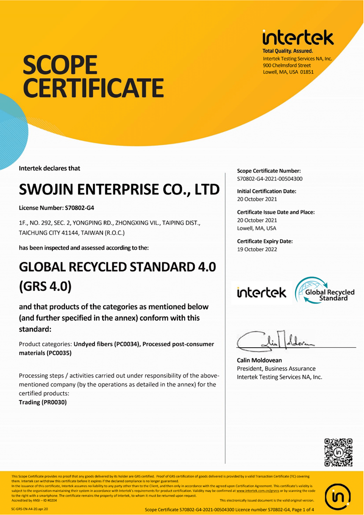 透過 GRS 認證,碩璟在紡織供應鏈上能更進一步提供客戶更多元、環保的選擇,除本身落實 GRS 環保要求外,更協助監督供應鏈廠商之回收物料品質、落實社會責任、遵守環保要求、杜絕環境有害之化學物。