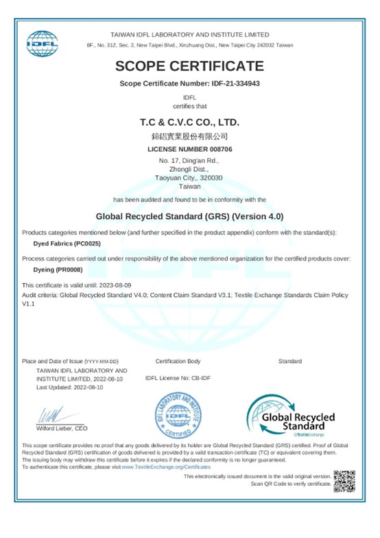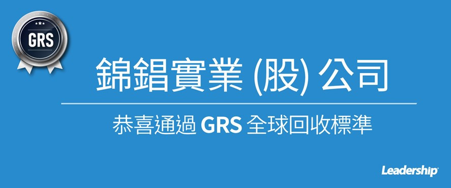 在領導力企管專業顧問輔導下,錦錩實業股份有限公司已順利完成 GRS全球回收標準 ( Global Recycled Standard ) 的教育訓練(Training)、系統建置(Implementing)、外部稽核驗證 (Certification)3大實施流程,順利取得 GRS 證書。