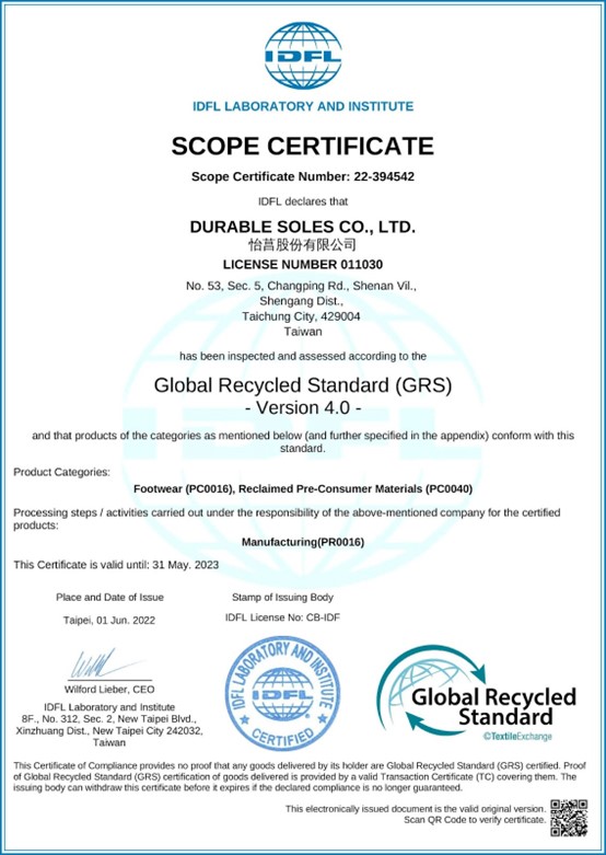 (Recycled Claim Standard) 的教育訓練(Training)、系統建置(Implementing)、外部稽核驗證 (Certification)3大實施流程,並順利取得 GRS 證書。認證項目更是領先全球獨家橡膠預拌料、(Rubber Compounds)、以及鞋材鞋底 (Shoes)。