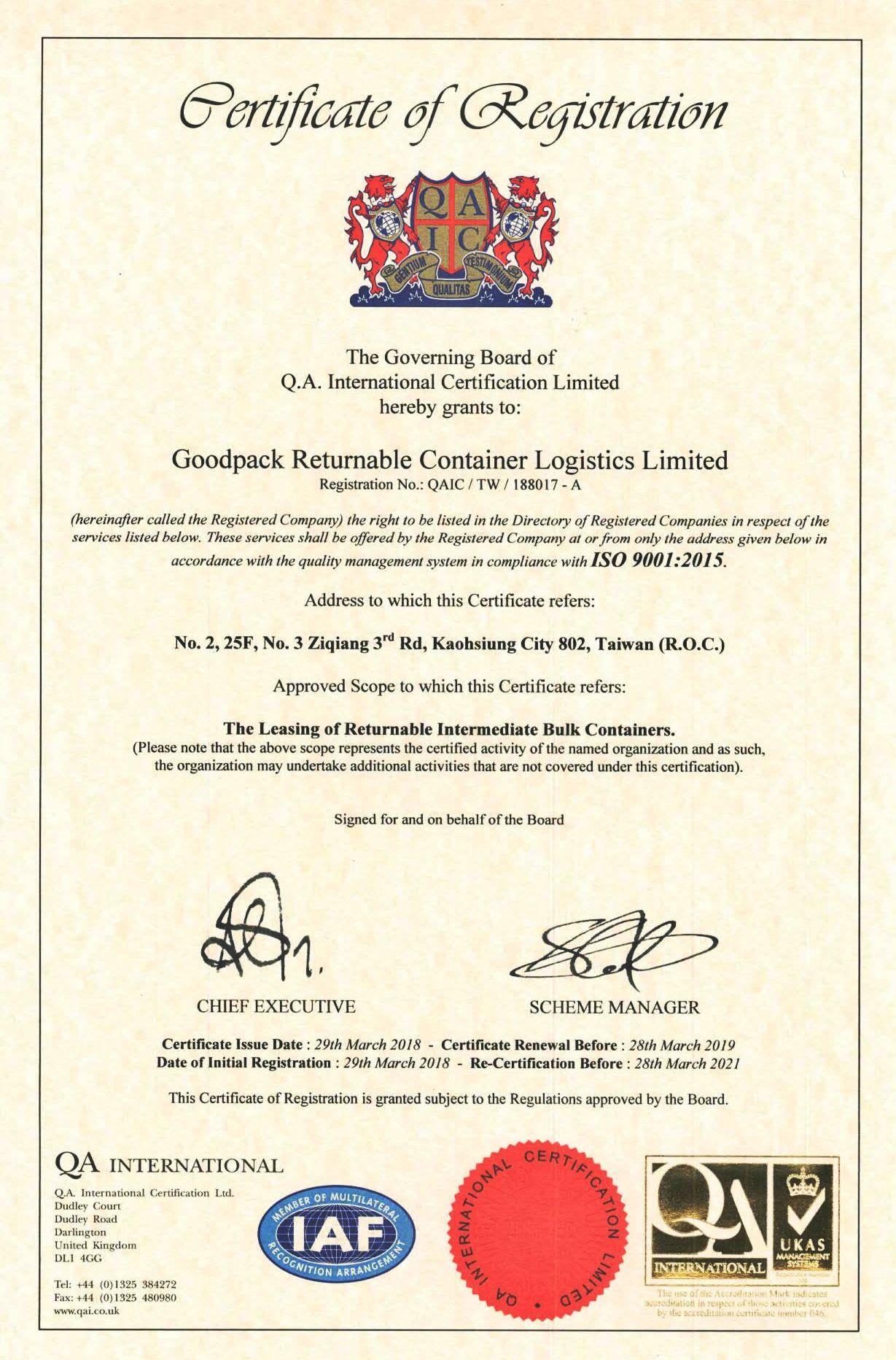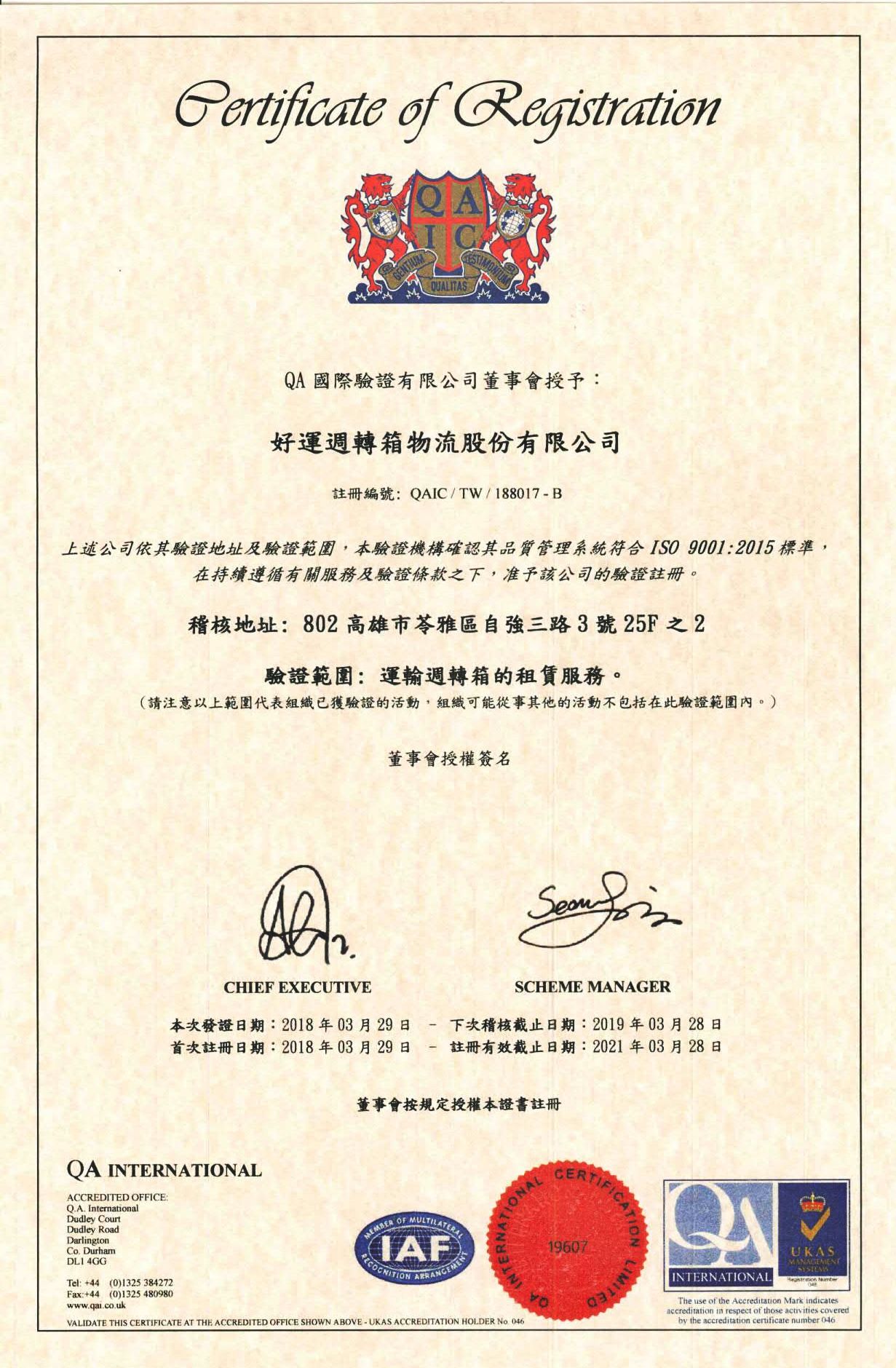 在領導力企管專業顧問輔導下,好運週轉箱物流股份有限公司已順利完成 ISO 9001:2015 品質管理系統(ISO 9001:2015 Quality Management Systems)教育訓練(Training)、系統建置(Implementing)、外部稽核驗證 (Certification)3大實施流程,並且榮獲 QA 頒發 ISO 9001:2015 品質管理系統新版證書。