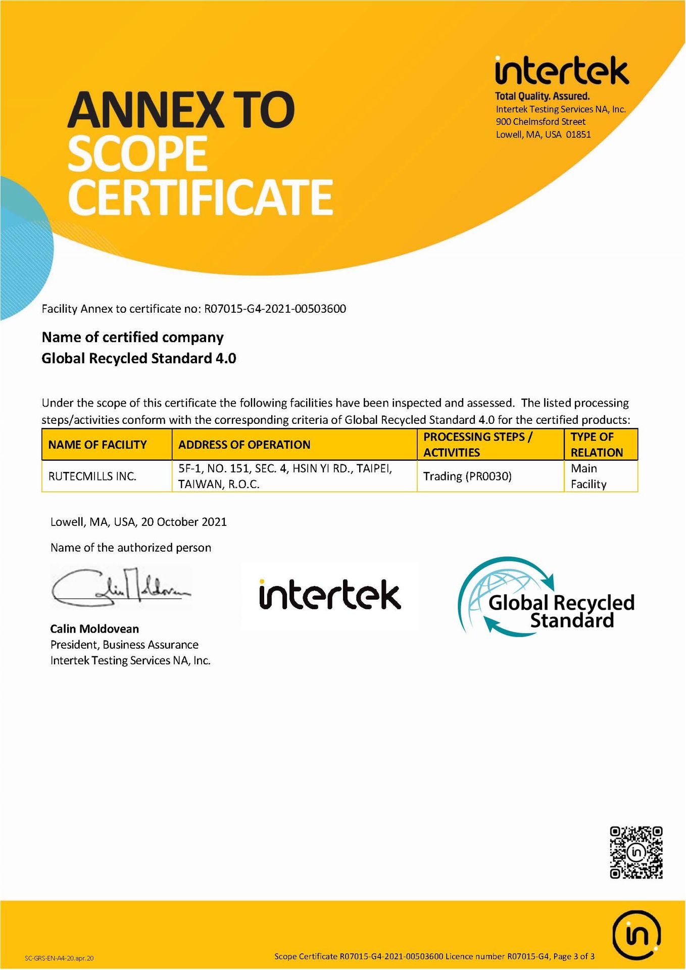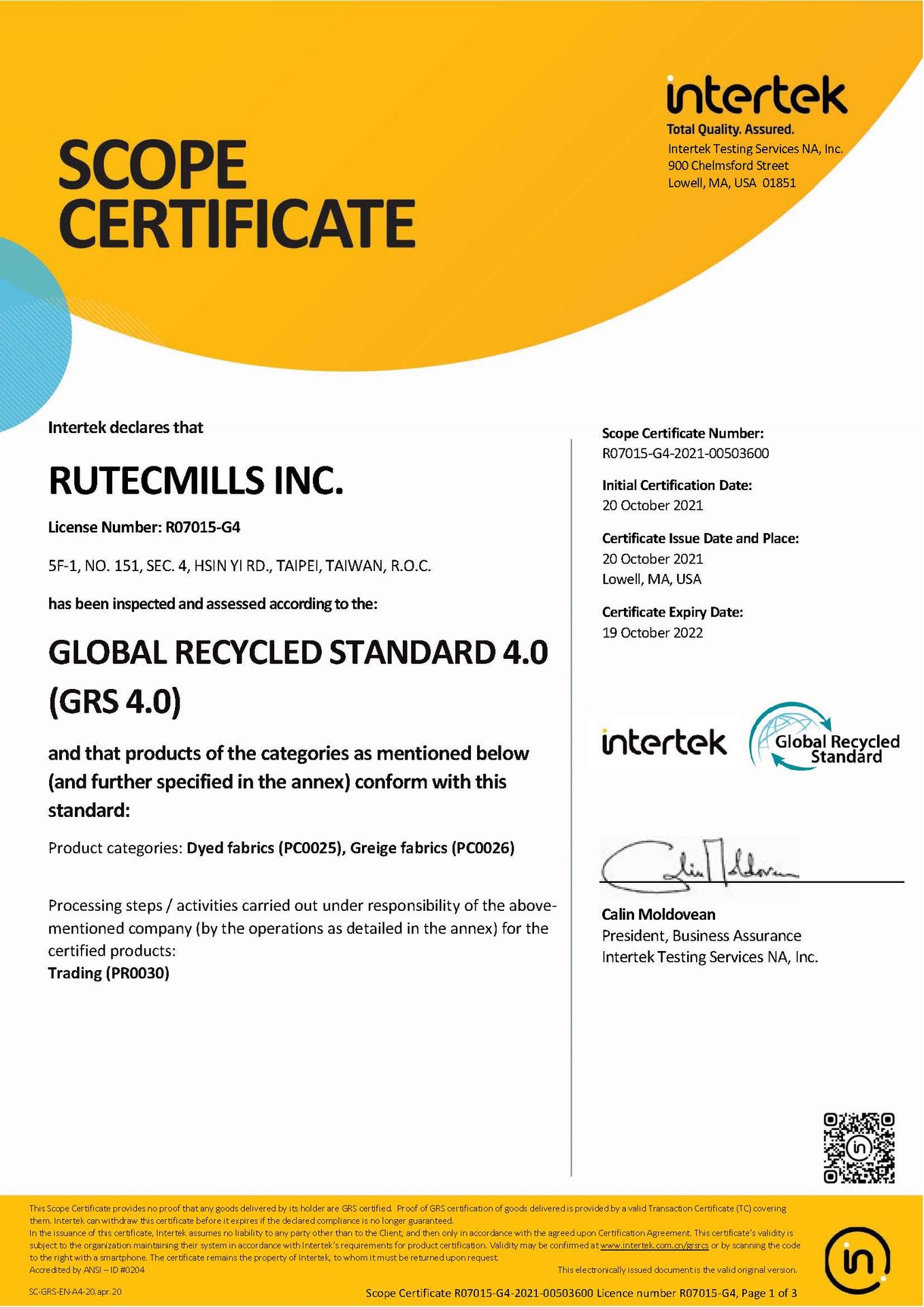 在領導力企管專業顧問輔導下,宏樺森有限公司(RUTECMILLS INC.)已順利完成 GRS全球回收標準 ( Global Recycled Standard ) 的教育訓練 ( Training ) 、系統建置 ( Implementing )、外部稽核驗證 ( Certification ) 3大實施流程,順利取得 GRS 證書。