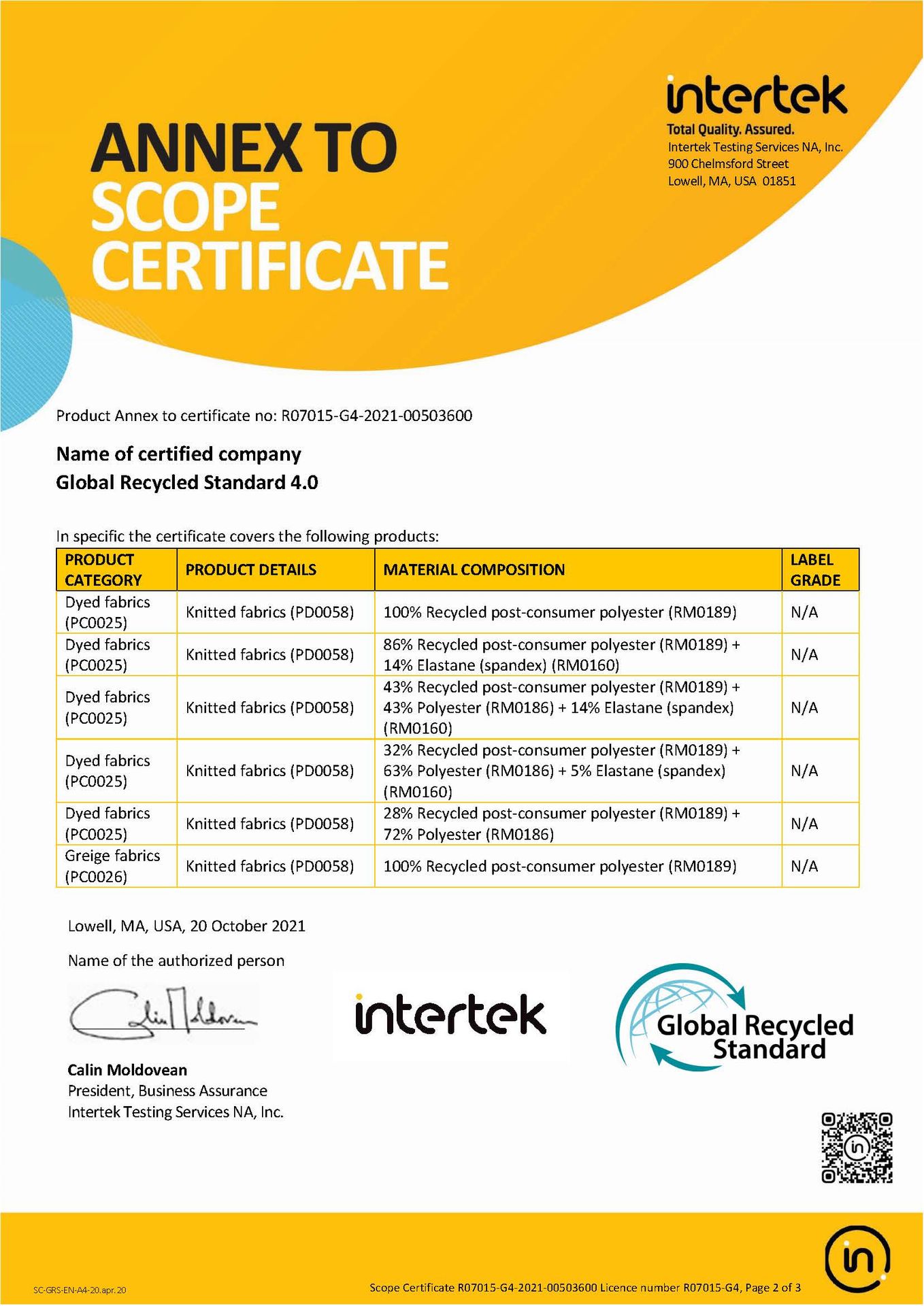 近年來環保意識抬頭、回收再利用議題正夯,自2008年 GRS/RCS 標準制定發表以來,以及國際品牌大廠(如:adidas、3M、PUMA、H&M、NIKE、UA、Burberry、Gap..)陸續要求供應鏈廠商通過此認證標準,全球正刮起一股環保回收風氣,期盼透過標準推廣回收再利用,亦能改善整個供應鏈上的員工工作條件、降低汙染、更其減少廢棄物以達真正永續的目標,預期後續會有愈來愈多業界夥伴會加入此認證標準行列。