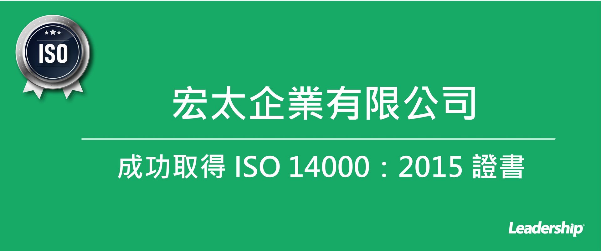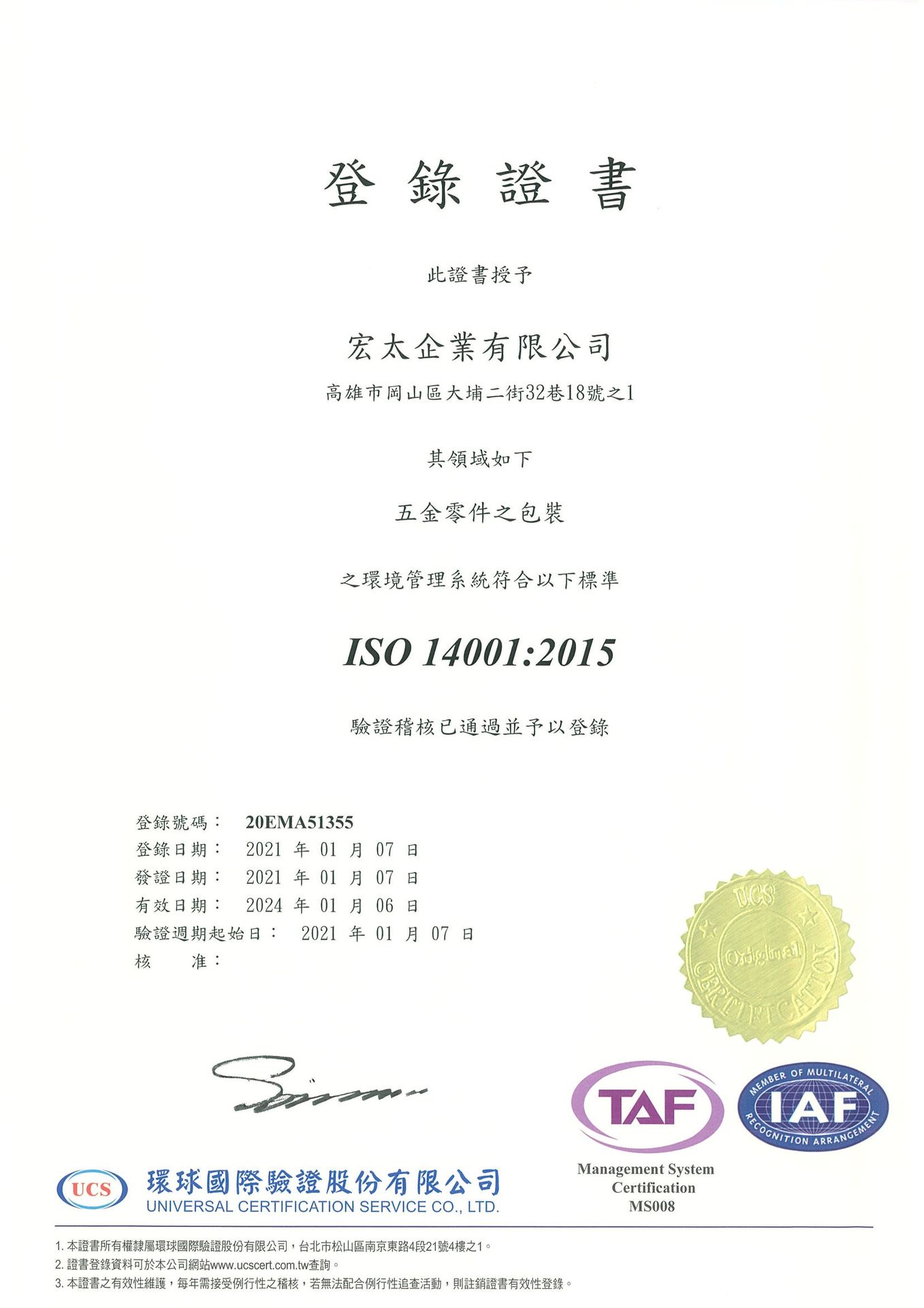 宏太企業取得 ISO 14001:2015 證書