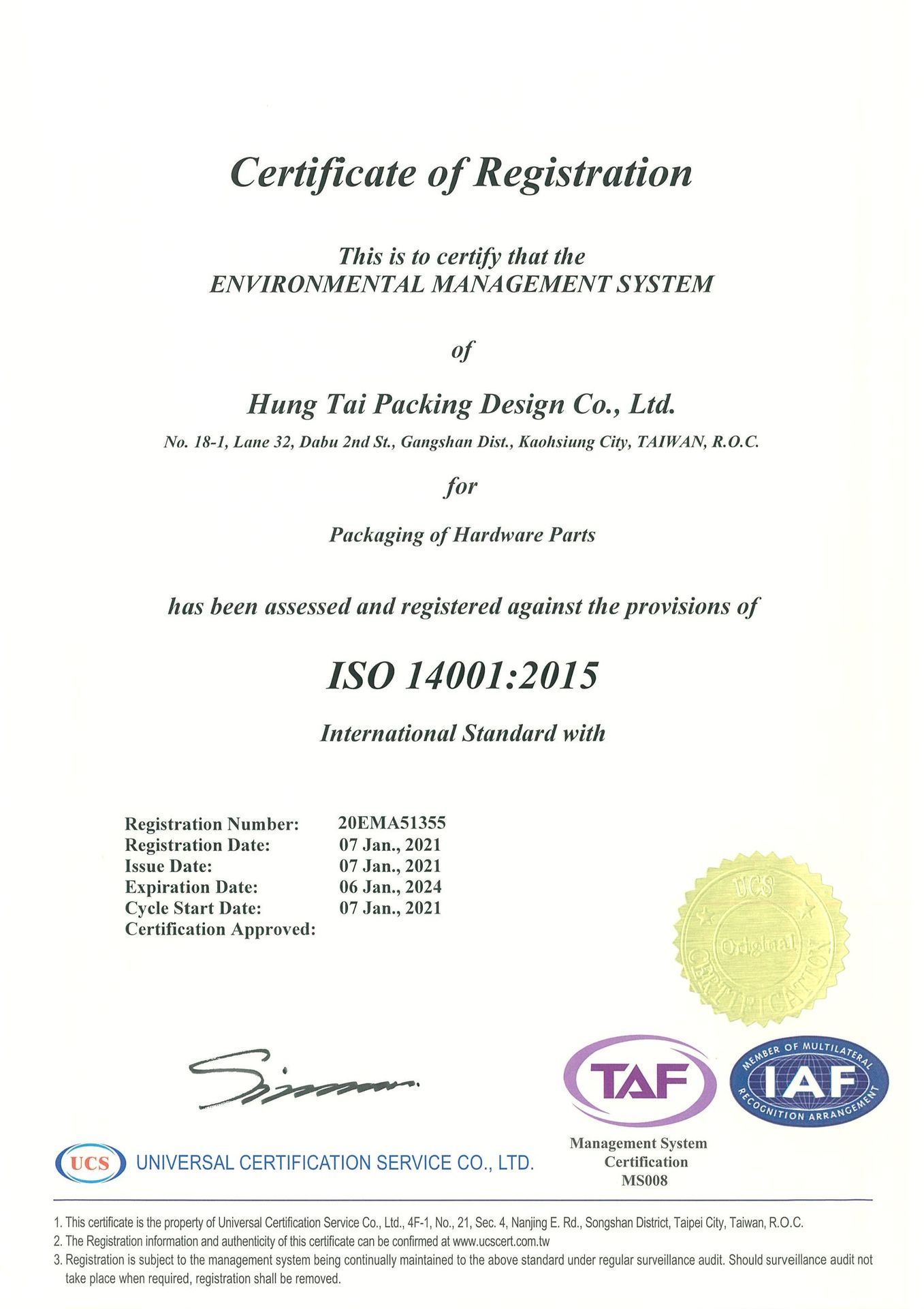 在領導力企管專業顧問輔導下,宏太企業有限公司已順利完成 ISO 14001:2015 環境管理系統(ISO 14001:2015 Environmental management)教育訓練(Training)、系統建置(Implementing)、外部稽核驗證 (Certification)3大實施流程,並且榮獲 ISO 14001:2015 環境管理系統證書。