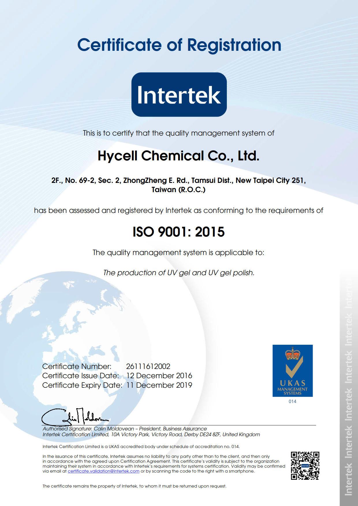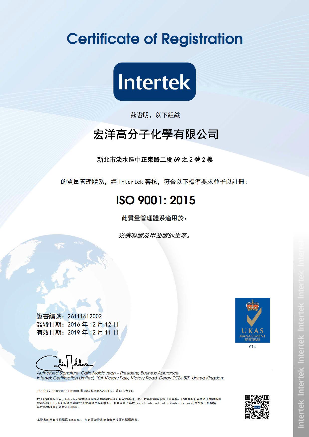 在領導力企管專業顧問輔導下,宏洋高分子化學有限公司已順利完成 (ISO 9001:2015 品質管理系統(ISO 9001:2015 Quality Management Systems)教育訓練(Training)、系統建置(Implementing)、外部稽核驗證 (Certification)3大實施流程,並且榮獲 INTERTEK頒發 ISO 9001:2015 品質管理系統新版證書。