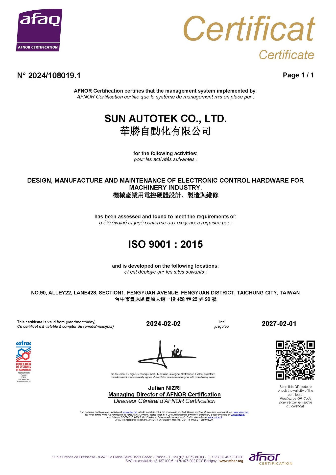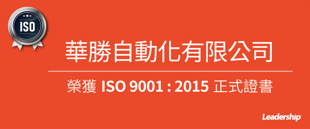 在領導力企管專業顧問輔導下,華勝自動化有限公司 已順利完成 ISO 9001 :2015 系統(ISO 9001:2015 Quality Management Systems)教育訓練(Training)、系統建置(Implementing)、外部稽核驗證(Certification)3大實施流程,順利取得 ISO 9001:2015 證書。