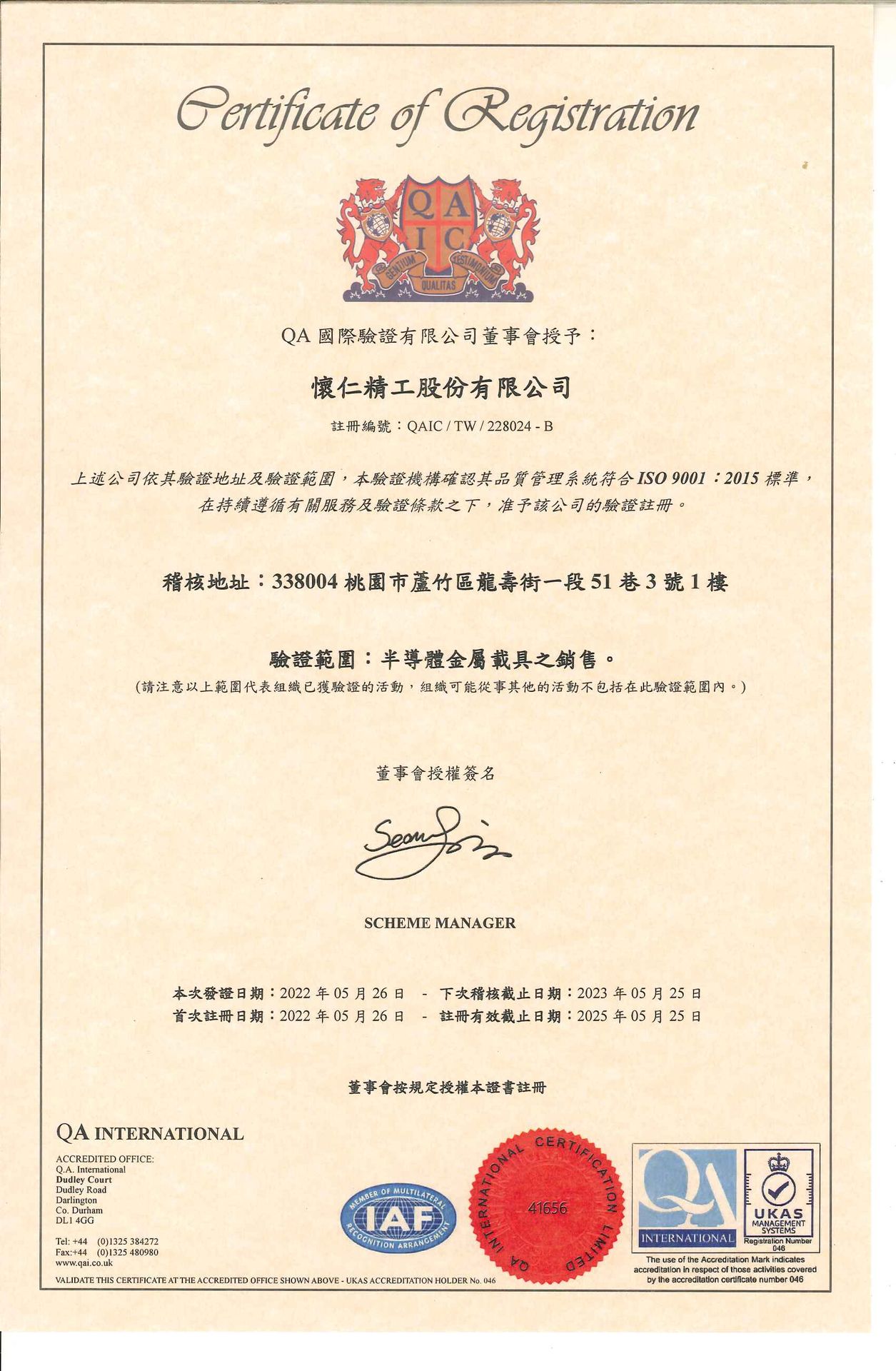 ▲恭喜懷仁精工取得 ISO 9001:2015 正式證書