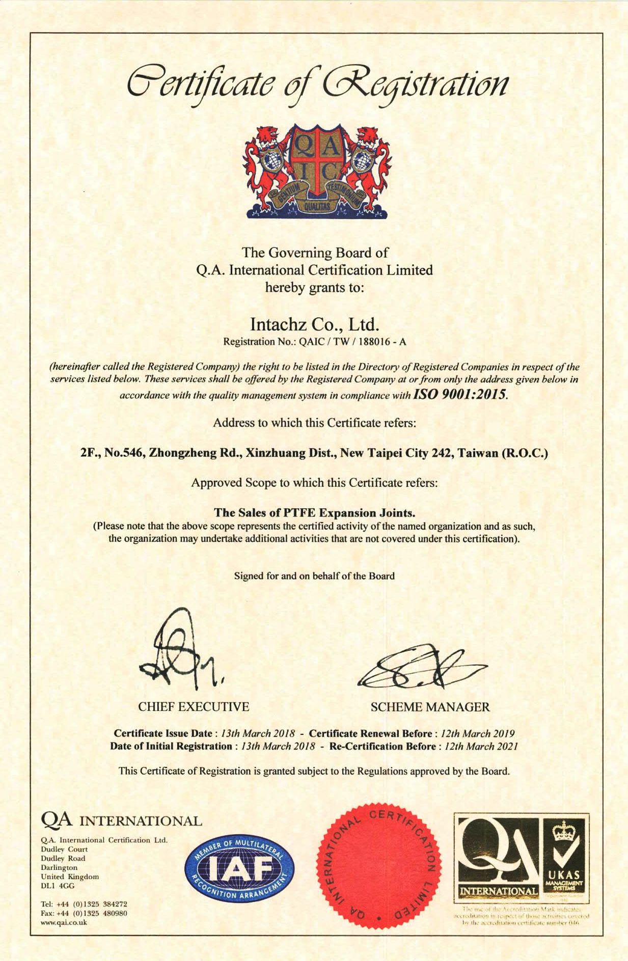 在領導力企管專業顧問輔導下,環乙有限公司已順利完成 ISO 9001:2015 品質管理系統(ISO 9001:2015 Quality Management Systems)教育訓練(Training)、系統建置(Implementing)、外部稽核驗證 (Certification)3大實施流程,並且榮獲 QA 頒發 ISO 9001:2015 品質管理系統新版證書。