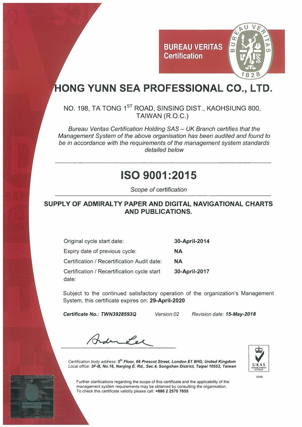 在領導力企管專業顧問輔導下,弘運海技有限公司已順利完成 ISO 9001:2015 品質管理系統(ISO 9001:2015 Quality Management Systems)教育訓練(Training)、系統建置(Implementing)、外部稽核驗證 (Certification)3大實施流程,並且榮獲 BV ISO 9001:2015 品質管理系統新版證書。