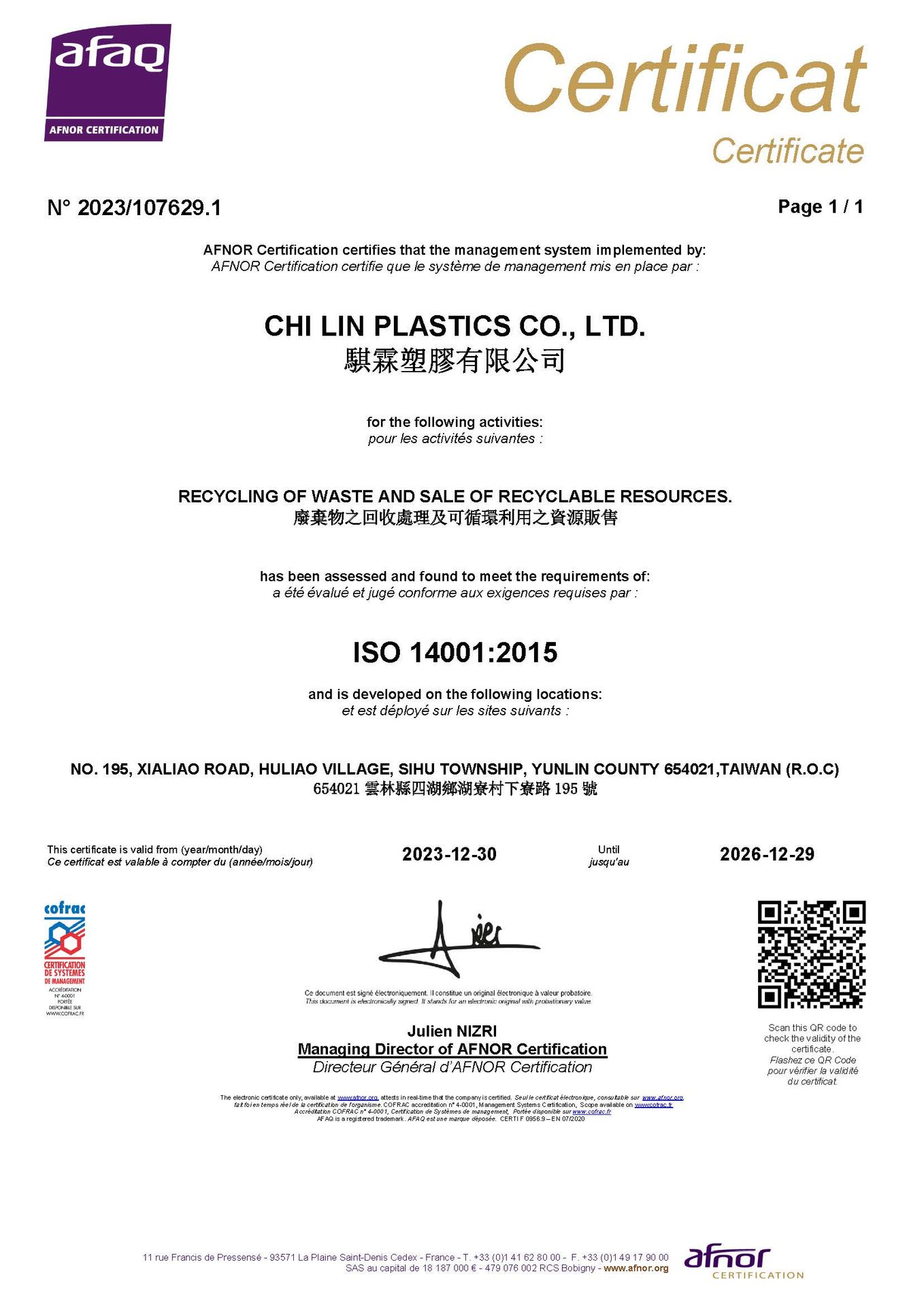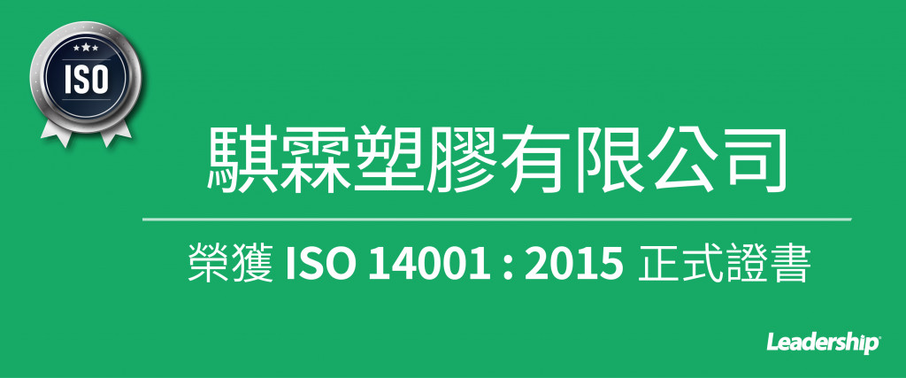 在領導力企業管理顧問公司專業輔導下,恭喜 騏霖塑膠有限公司 順利完成 ISO 14001 環境管理系統標準 的教育訓練(Training)、系統建置(Implementing)、外部稽核驗證 (Certification)3大實施流程,並順利取得 ISO 14001:2015 證書。