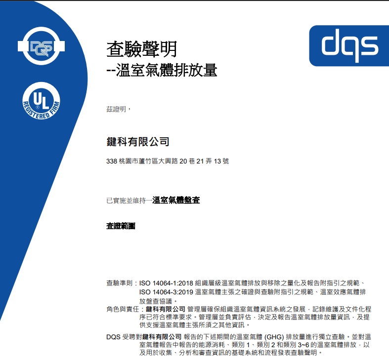 ▲恭喜鍵科取得DQS頒發ISO 14064-1查證申明書