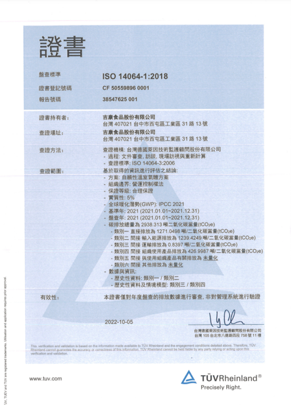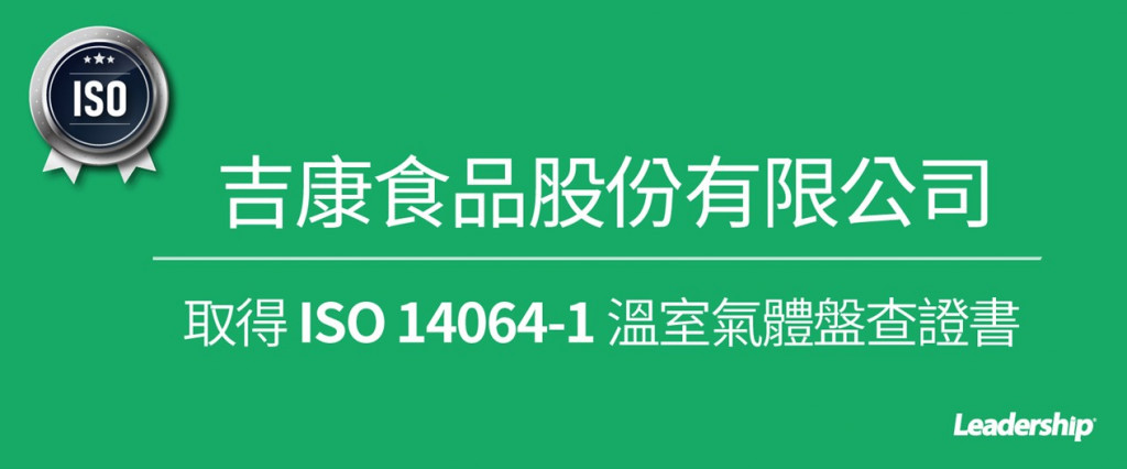 在領導力企管專業顧問輔導下,吉康食品股份有限公司 已順利完成 ISO 14064-1:2018(Greenhouse gases Part 1:Specification with guidance)溫室氣體盤查之教育訓練(Training)、系統建置(Implementing)、外部稽核驗證 (Certification)3大實施流程,順利取得 ISO 14064-1 溫室氣體盤查證書。