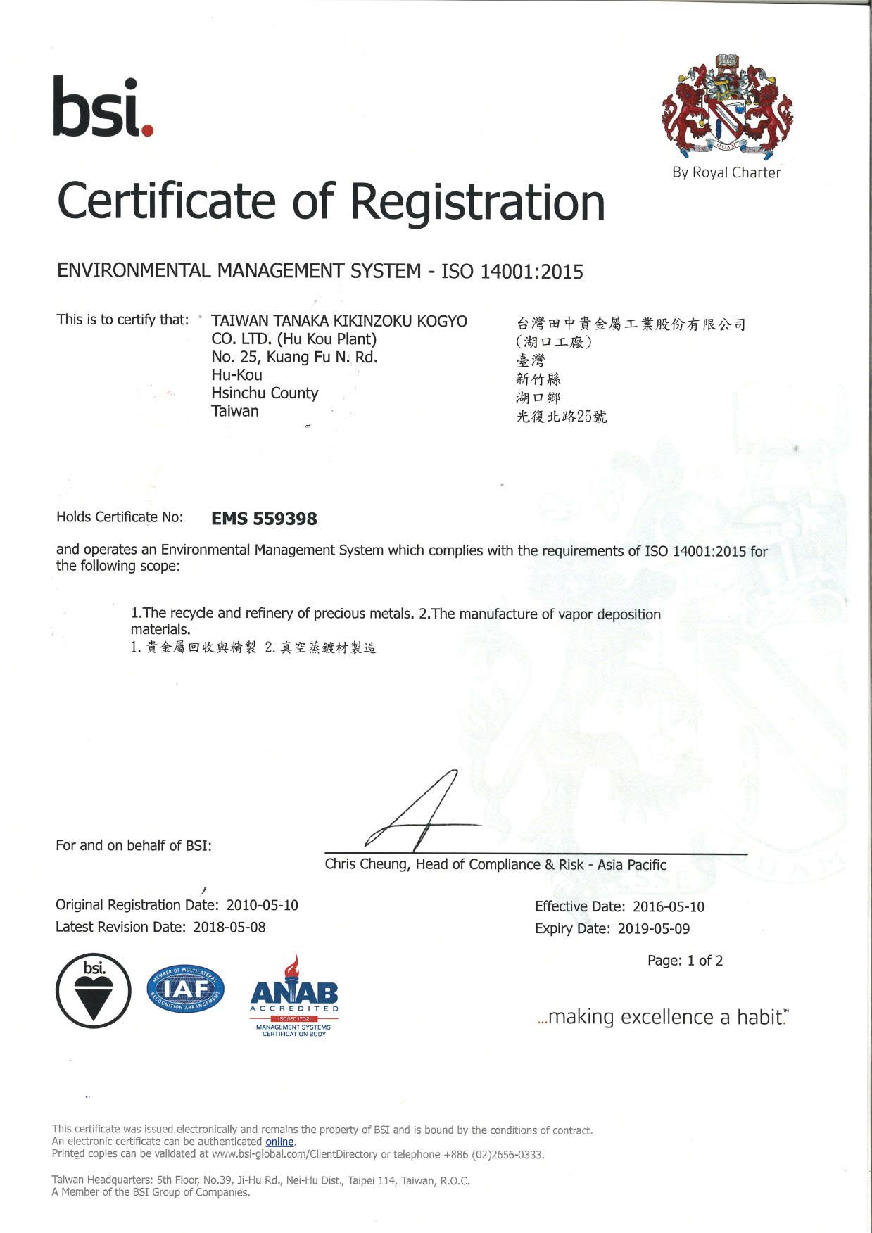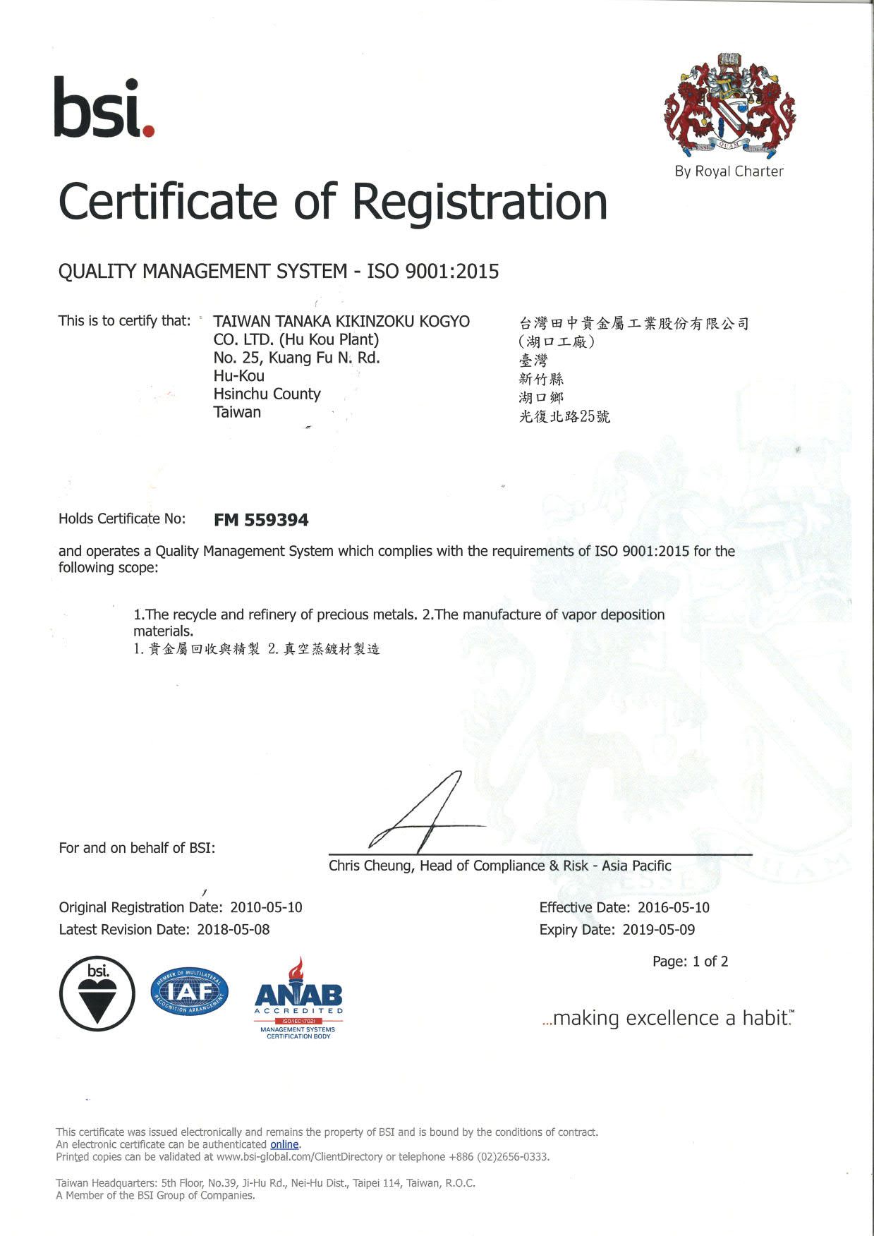 在領導力企管專業顧問輔導下,台灣田中貴金屬工業股份有限公司已順利完成ISO 9001:2015 & ISO 14001:2015教育訓練(Training)、系統建置(Implementing)、外部稽核驗證(Certification)3大實施流程。