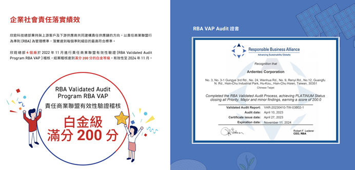 RBA 是國際公認的 ESG 認證與 CSR 認證指標之一,企業透過RBA認證(正式名稱為 RBA VAP),等同於倡議 ESG 並履行 CSR (企業社會責任),同時也須歸功於品牌大廠的推波與支持,讓整個電子供應鏈從金屬礦場到後端成品製造的每個環節中,所有直接與間接員工得到基本員工人權、工作環境安全有保障、降低環境汙染衝擊、負起企業誠信與公平交易之基本責任。