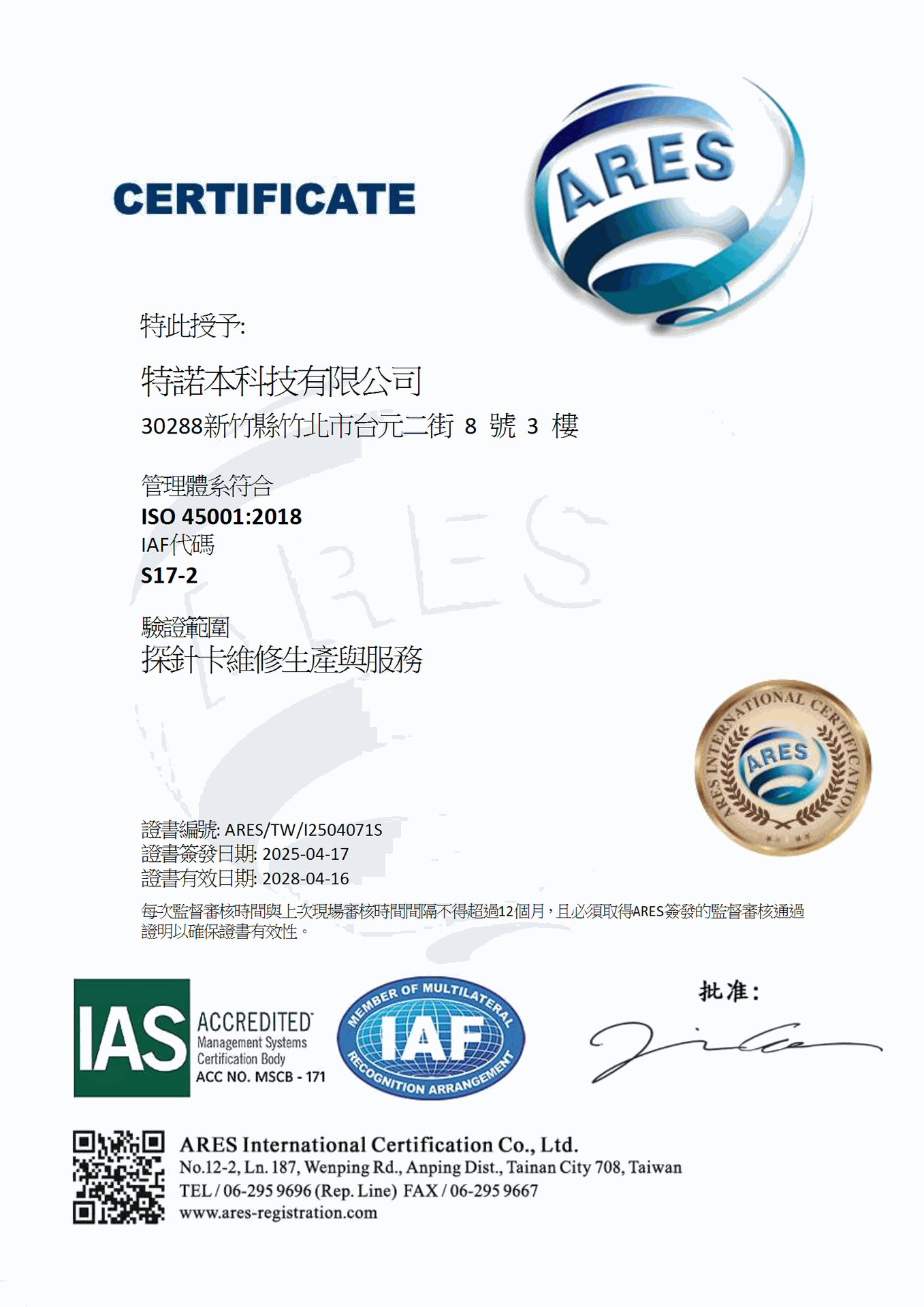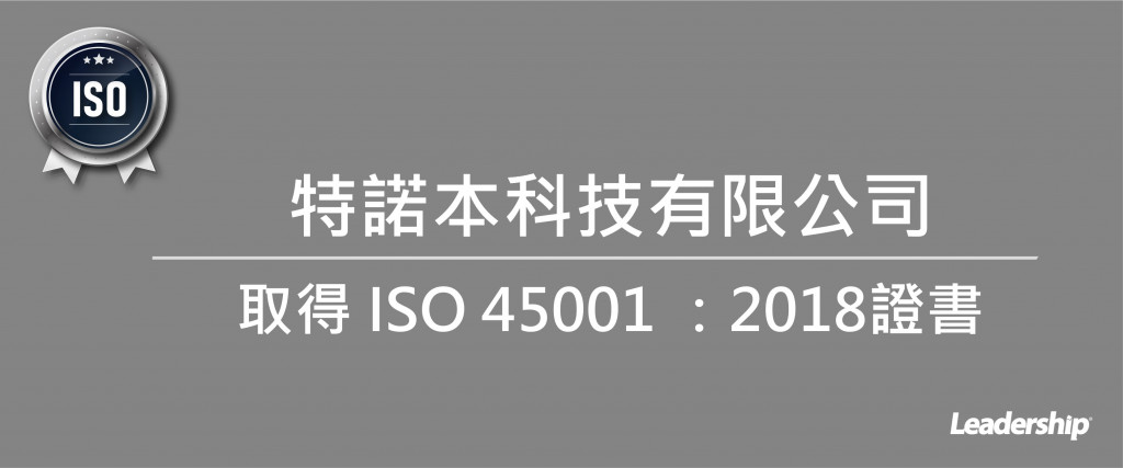 在領導力企管專業顧問的輔導下,特諾本科技有限公司順利完成 ISO 45001:2018 職業安全衛生管理系統(ISO 45001 :2018 Occupational Health and Safety Management Systems)的建置與驗證作業,歷經教育訓練(Training)、系統建置(Implementing)及外部稽核(Certification)三大實施階段,成功取得 ISO 45001:2018 認證,全面強化其職場安全與組織管理效能。