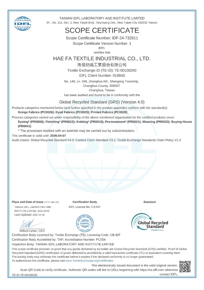▲恭喜海發紡織成功取得 IDFL 頒發的 GRS4.0證書