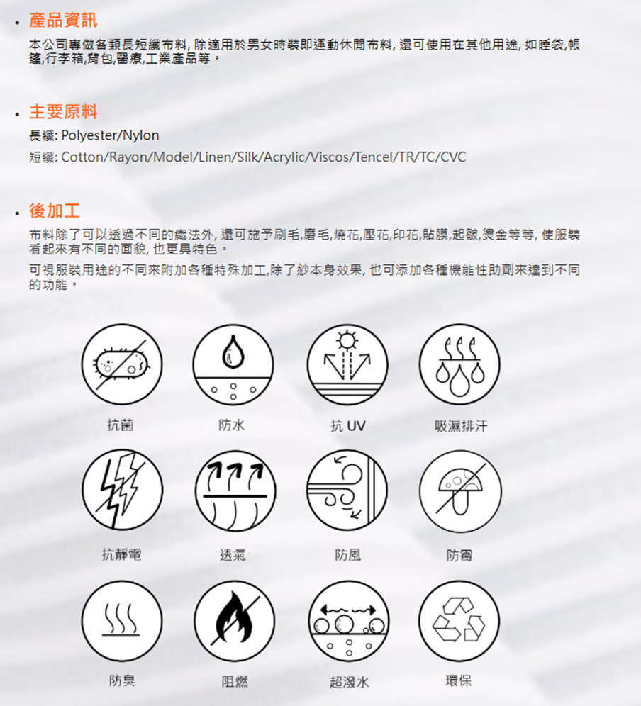 為滿足全球客戶多元且日益成長的需求,海發集團持續擴展產品線與生產基地,與多家重視品質的布料廠合作,專注於短纖纖維布種,提供品質穩定、價格具競爭力的產品。公司深知品質控管與交期穩定的重要性,自 2003 年即設立專業品管團隊,所有驗貨人員皆須通過台灣主管的嚴格訓練與考核,並採用國際標準「四點制」驗布制度,確保出貨品質達到客戶高度滿意。