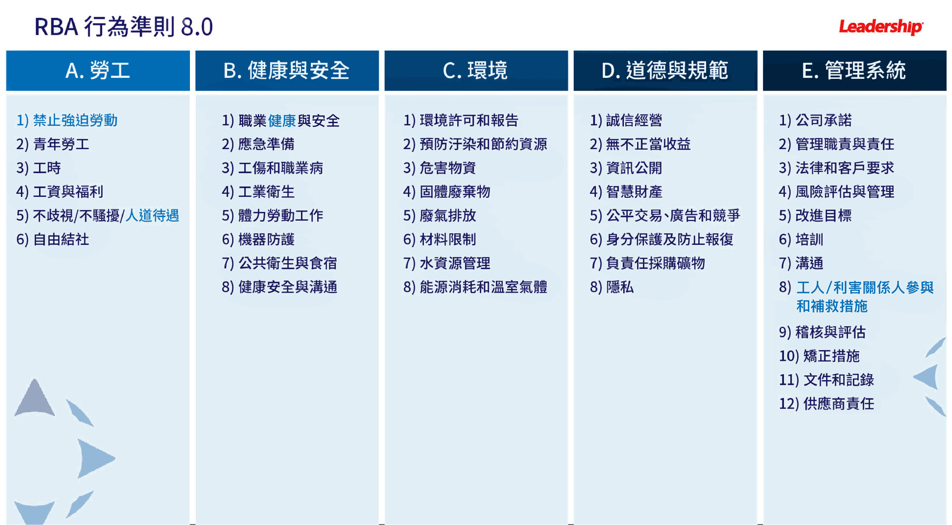 RBA 制定的行為準則涵蓋勞動人權、工作安全、環境保護與商業道德,呼應《聯合國企業與人權指導原則》、國際勞工組織的《工作基本原則與權利宣言》以及《世界人權宣言》。這些準則幫助企業從上游到下游理解和實踐更人道、更合規的標準,提升企業信譽和市場競爭力。RBA促進企業社會責任的全面落實,保障員工、環境和消費者的利益,增強企業的社會形象。同時,RBA的導入有助於提升內部管理效率和質量,促使企業在勞工健康安全、環境保護等方面達到更高標準,並促進供應鏈透明化和責任化,降低供應鏈風險,對企業的長期發展具有深遠意義。