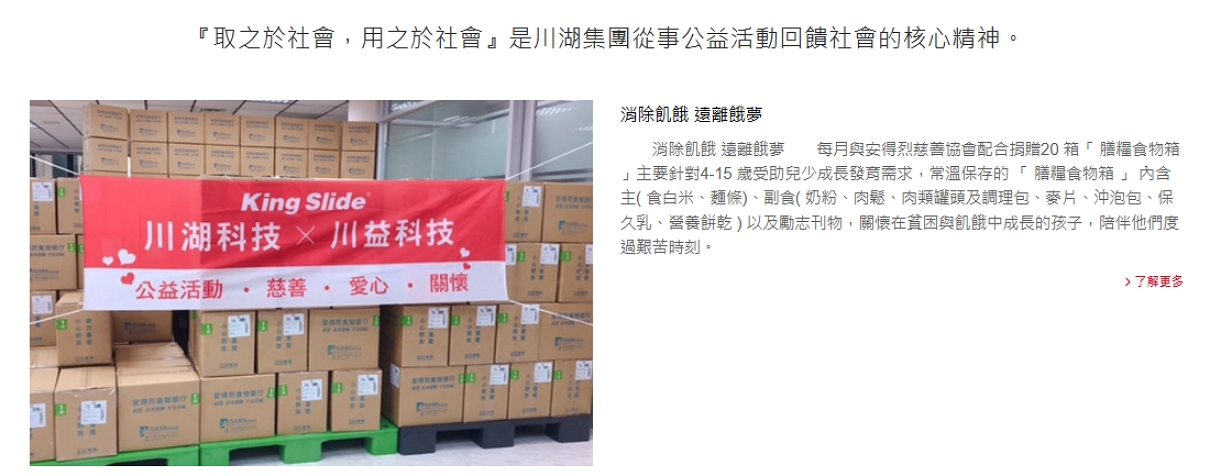 川湖科技股份有限公司成立於 1986 年,起步於生產鉸鏈、滑軌等產品。憑藉不斷的創新與研發,公司成功打造自有品牌 King Slide,專注於綠色創新機構產品,並將其行銷全球,躍升為國際知名的伺服器導軌、工業用導軌及電子零組件等機構產品的大廠。