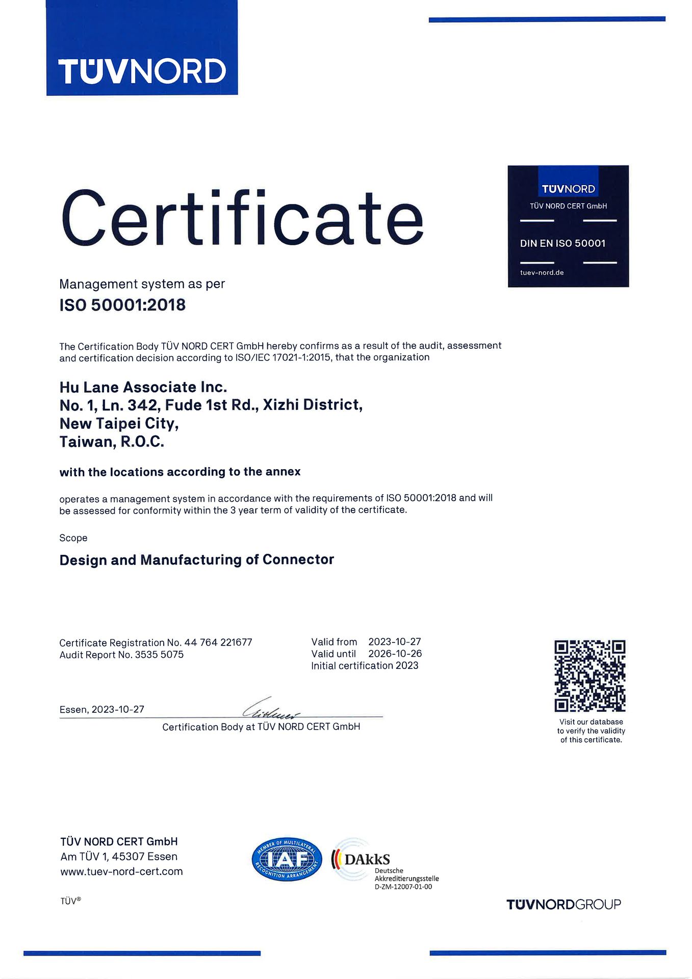 胡連精密秉持「誠信務實、技術創新、客戶滿意、共榮共存、放眼天下」的經營理念,以成為全球前十大汽機車連接器供應商為目標,不斷推動技術創新與產品卓越開發。為進一步強化企業的永續經營和能源管理,胡連精密已正式導入 ISO 50001 能源管理系統,展現公司在環保與節能方面的長期承諾。