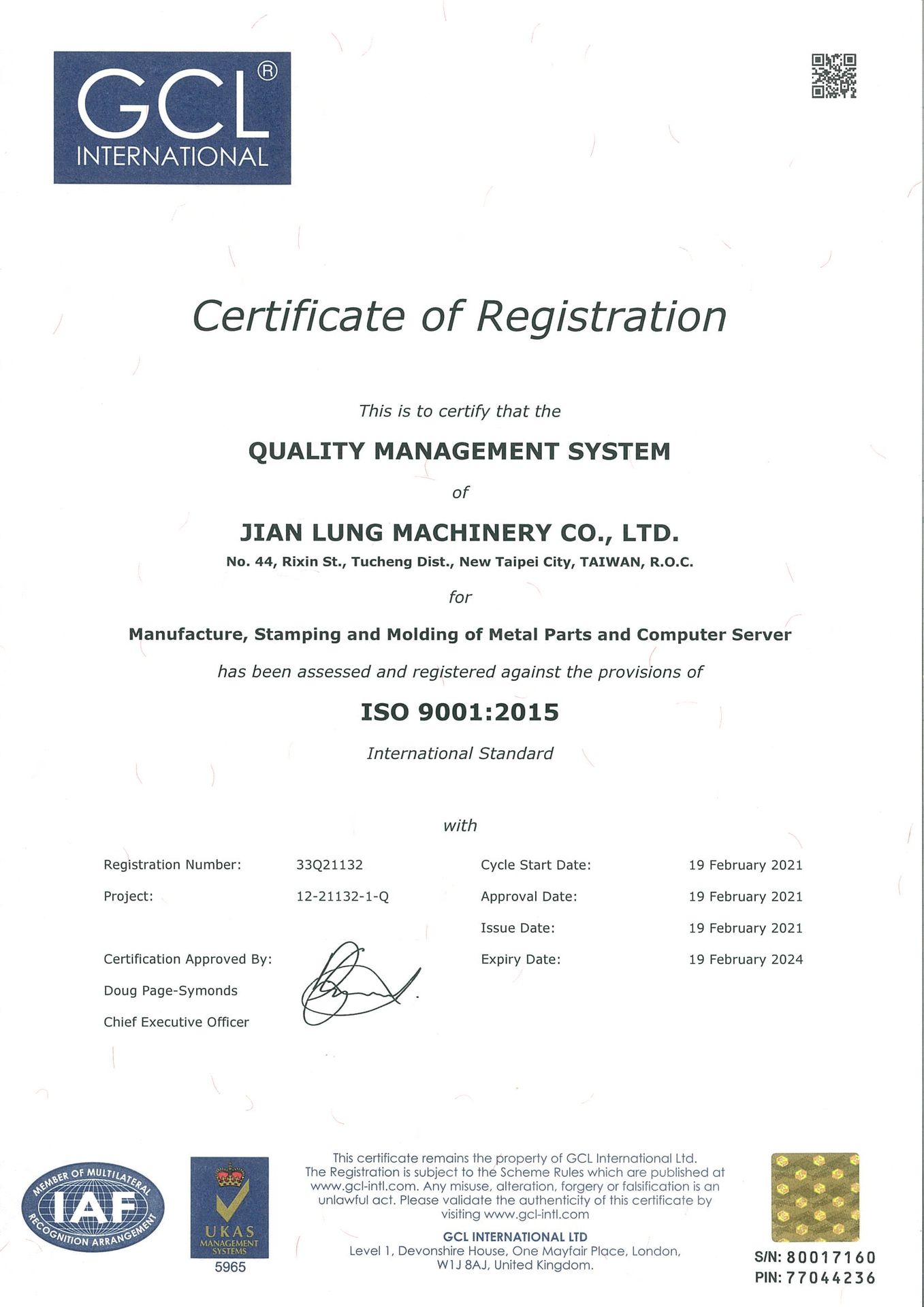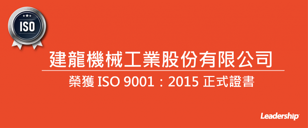 在領導力企管專業顧問輔導下,建龍機械工業股份有限公司已完成 ISO 9001:2015 品質管理系統(ISO 9001 :2015 Quality Management Systems)教育訓練(Training)、系統建置(Implementing)、外部稽核驗證 (Certification)3 大實施流程,順利取得 ISO 9001 :2015 品質管理系統證書。
