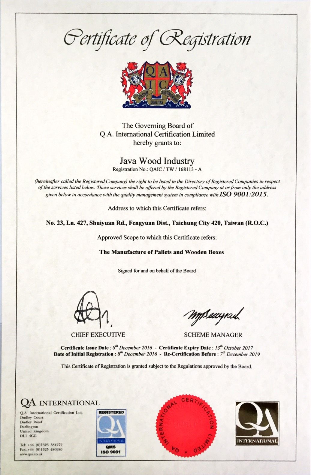 在領導力企管專業顧問輔導下,頡發木業有限公司已順利完成 (ISO 9001:2015 品質管理系統(ISO 9001:2015 Quality Management Systems)教育訓練(Training)、系統建置(Implementing)、外部稽核驗證 (Certification)3大實施流程,並且榮獲 QA頒發 ISO 9001:2015 品質管理系統新版證書。