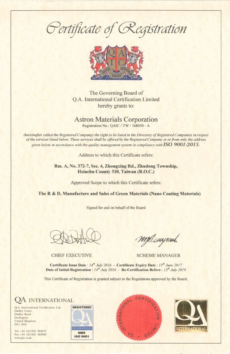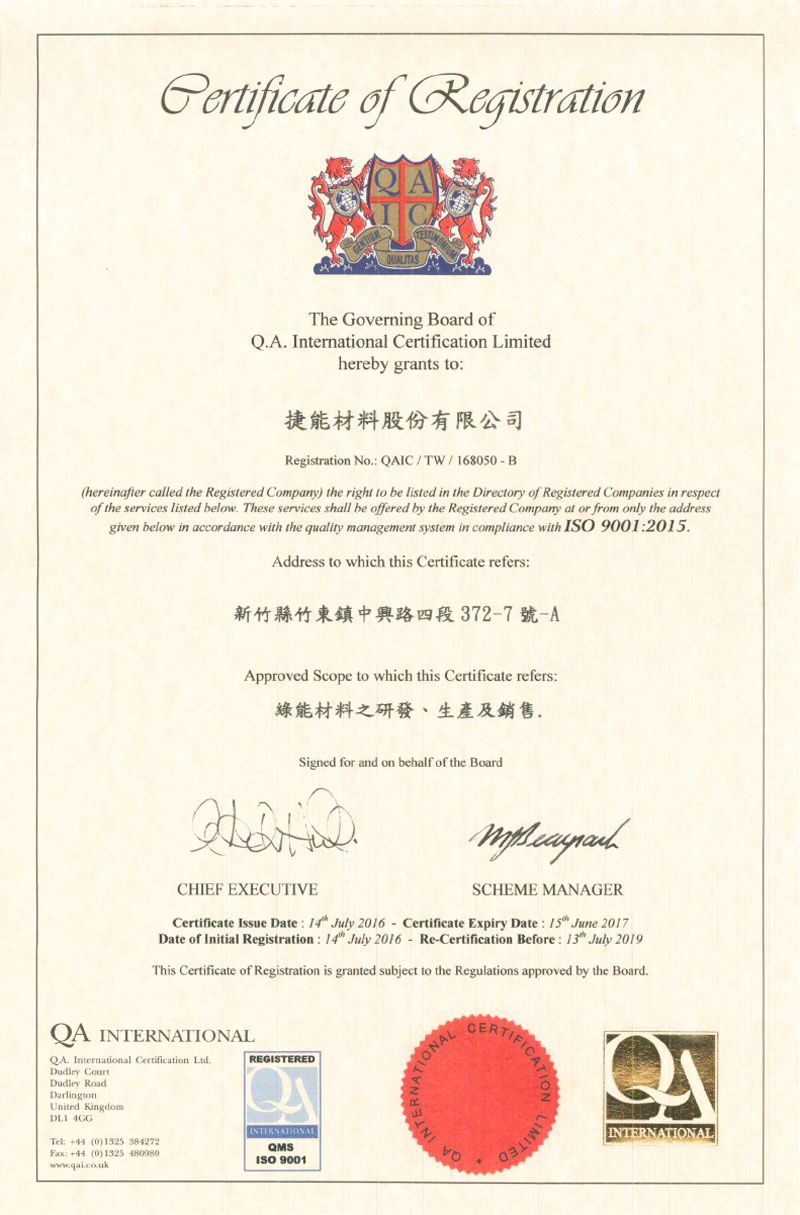 在領導力企管專業顧問輔導下,捷能材料股份有限公司已順利完成 ISO 9001:2015 品質管理系統(ISO 9001:2015 Quality Management Systems) 教育訓練(Training)、系統建置(Implementing)、外部稽核驗證 (Certification)3大實施流程,並且榮獲 QA 頒發 ISO 9001:2015 品質管理系統新版證書。