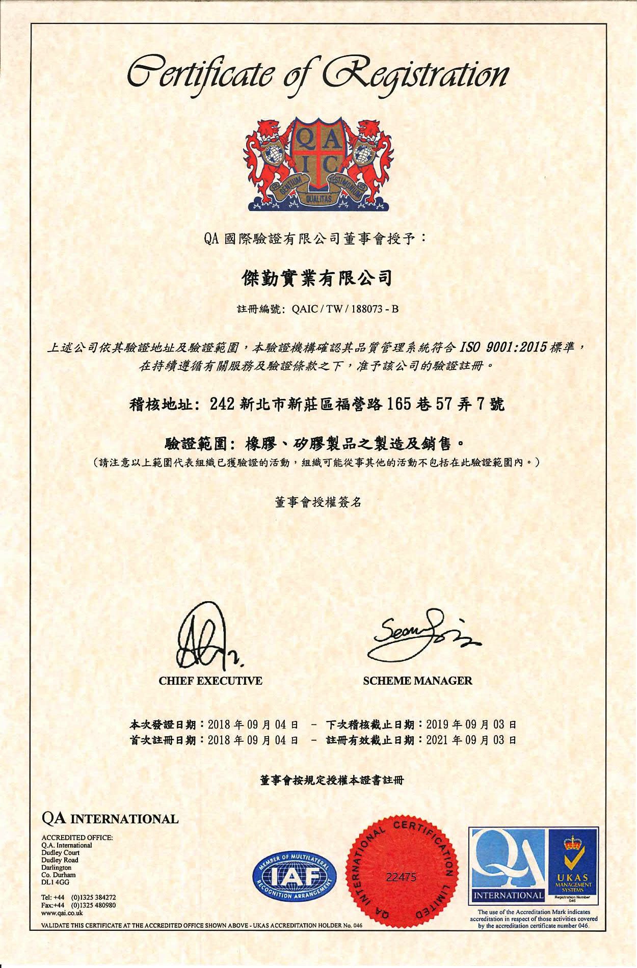 在領導力企管專業顧問輔導下,傑勤實業有限公司已順利完成 ISO 9001:2015 品質管理系統(ISO 9001:2015 Quality Management Systems)教育訓練(Training)、系統建置(Implementing)、外部稽核驗證(Certification)3大實施流程,並且獲頒 QA ISO 9001:2015 品質管理系統證書。