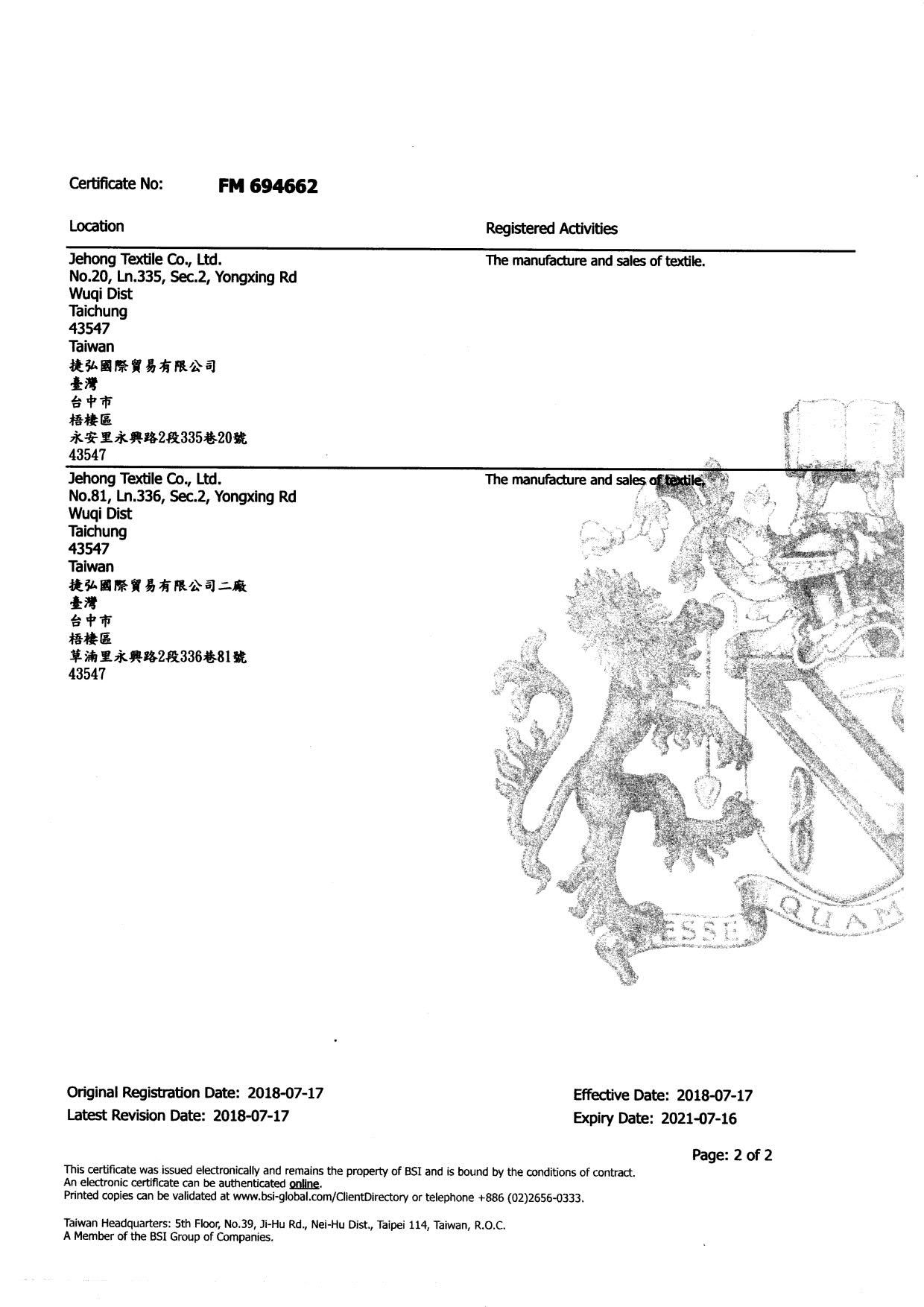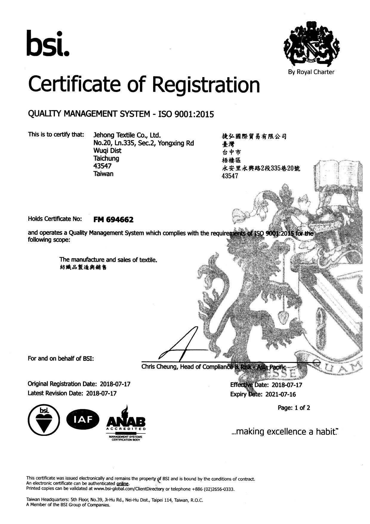 在領導力企管專業顧問輔導下,捷弘國際貿易有限公司已順利完成 ISO 9001:2015 品質管理系統(ISO 9001:2015 Quality Management Systems)教育訓練(Training)、系統建置(Implementing)、外部稽核驗證 (Certification)3大實施流程,並且榮獲 BSI ISO 9001:2015 新版證書。