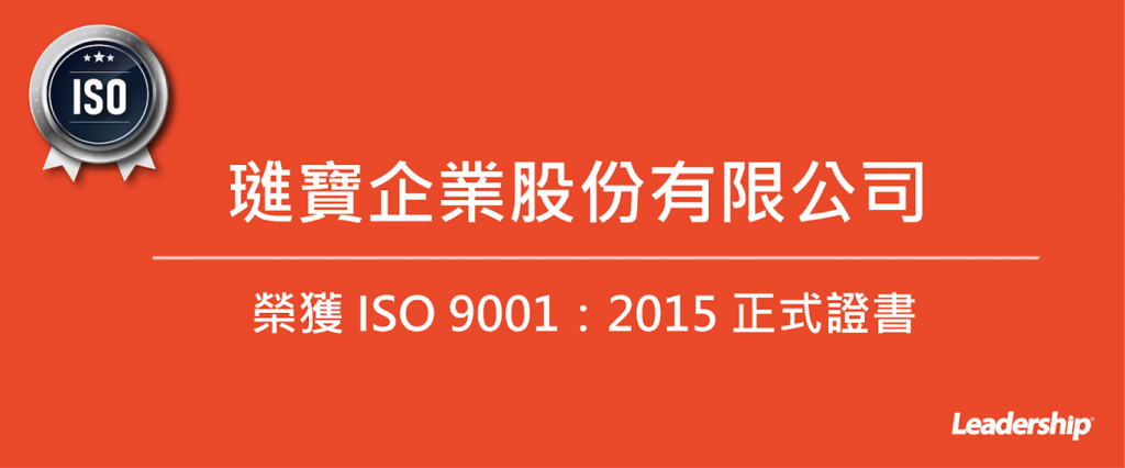 在領導力企管專業顧問輔導下,璡寶企業股份有限公司已順利完成 ISO 9001 :2015系統 (ISO 9001:2015 Quality Management Systems)教育訓練(Training)、系統建置(Implementing)、外部稽核驗證 (Certification)3大實施流程,順利取得 ISO 9001:2015 證書。