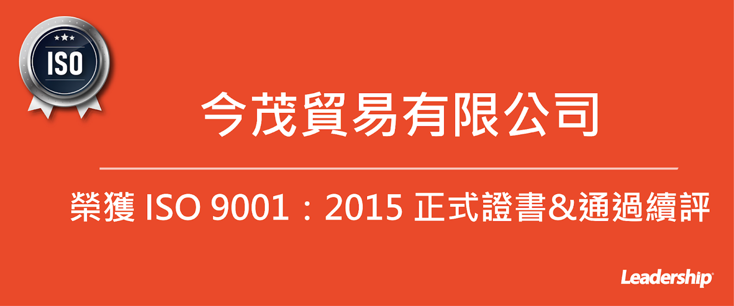 在領導力企管專業顧問輔導下,今茂貿易有限公司已順利完成 ISO 9001:2015 系統(ISO 9001:2015 Quality Management Systems)教育訓練(Training)、系統建置(Implementing)、外部稽核驗證(Certification)3大實施流程,順利取得 ISO 9001:2015證書及 ISO 9001:2015 續評。