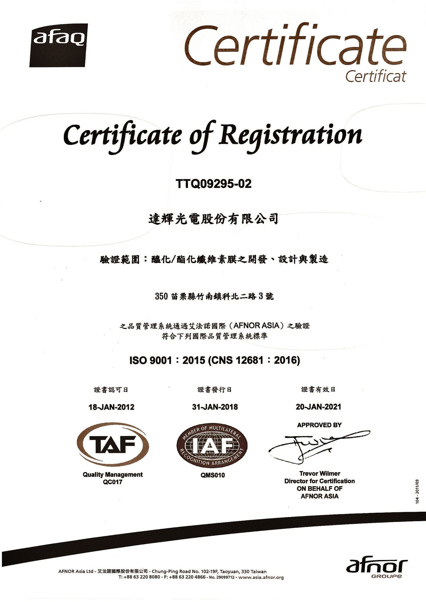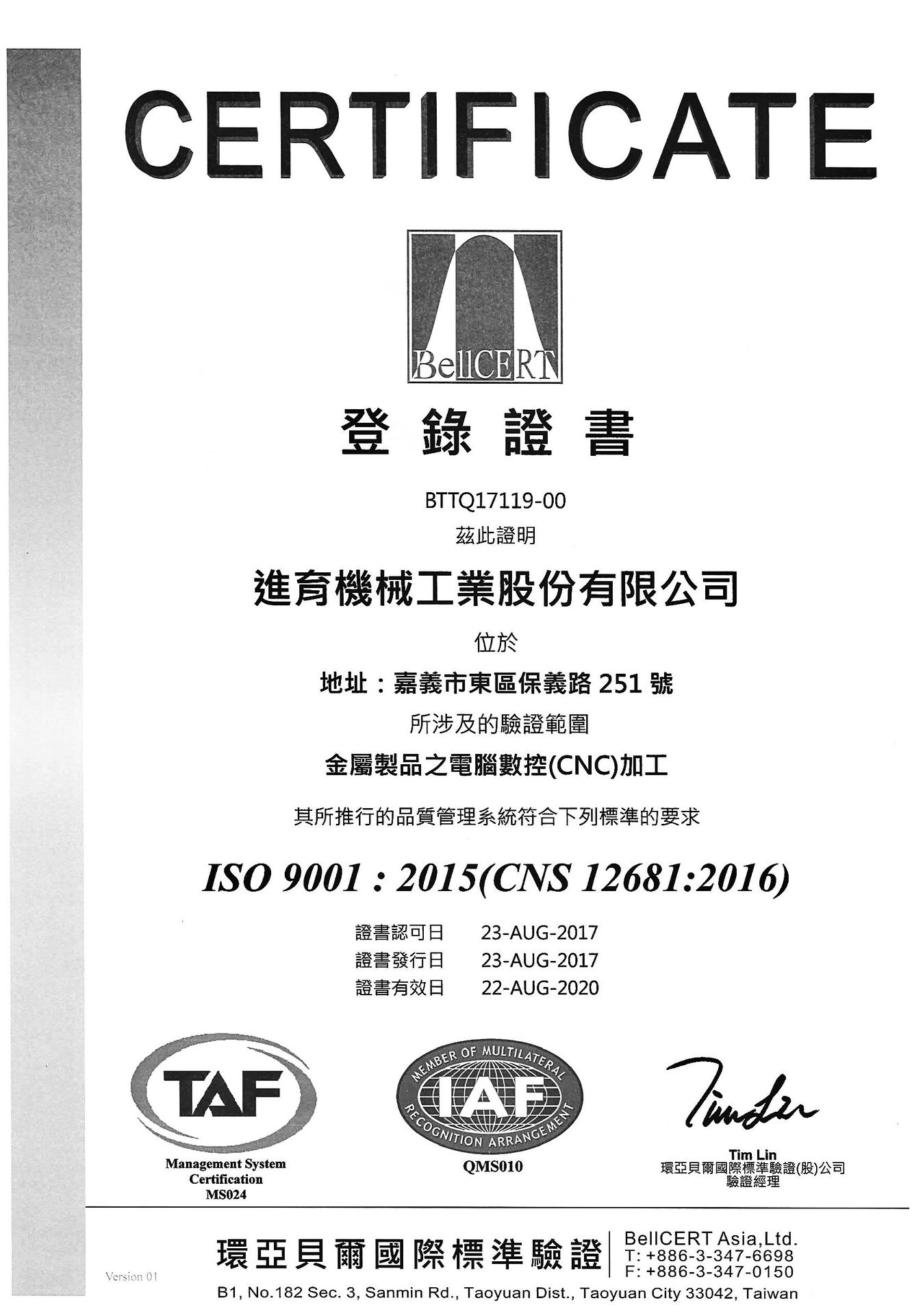 在領導力企管專業顧問輔導下,進育機械工業股份有限公司已順利完成 ISO 9001:2015 品質管理系統(ISO 9001:2015 Quality Management Systems)教育訓練(Training)、系統建置(Implementing)、外部稽核驗證 (Certification)3大實施流程,並且榮獲 AFNOR頒發 ISO 9001:2015 品質管理系統新版證書。