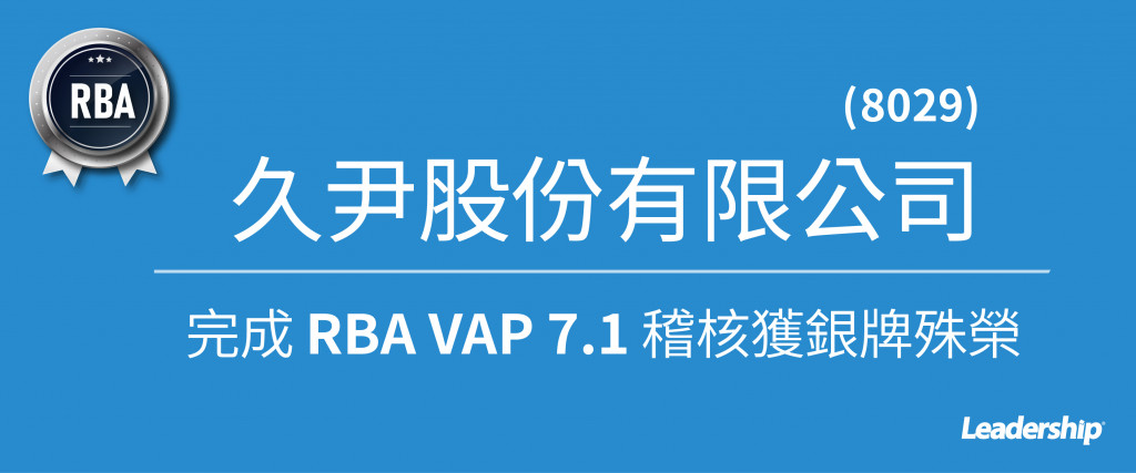 在領導力企管專業顧問輔導下,久尹 (8029) 已順利完成責任商業聯盟行為準則 RBA COC 7.0 & VAP 7.1,順利完成 RBA VAP 稽核,並獲 163 分的銀牌殊榮,2022 年 RBA VAP 稽核的全球平均分數為 143分(參考 RBA 2022 年報),也就是說久尹的 RBA 稽核成績落點在全球進行 VAP 之 1622 家企業中的前 20% ,可以說 ESG 實力堅強!