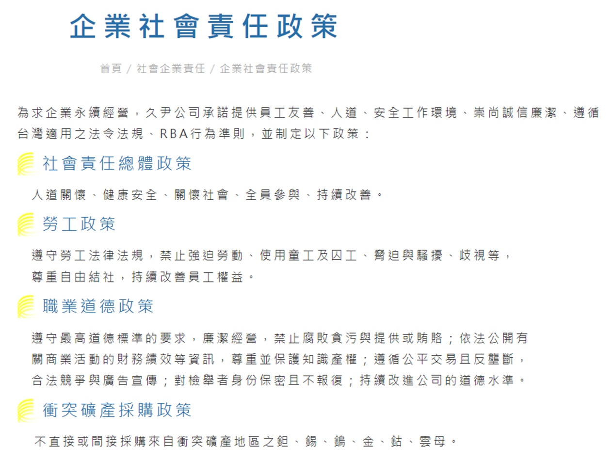 ▲ 久尹的社會責任政策(資料來源:久尹官網)