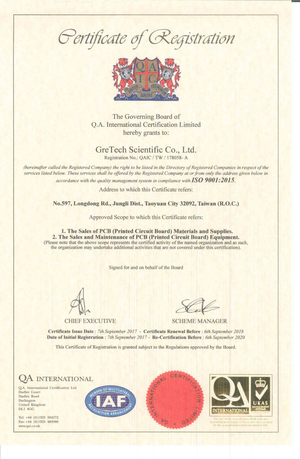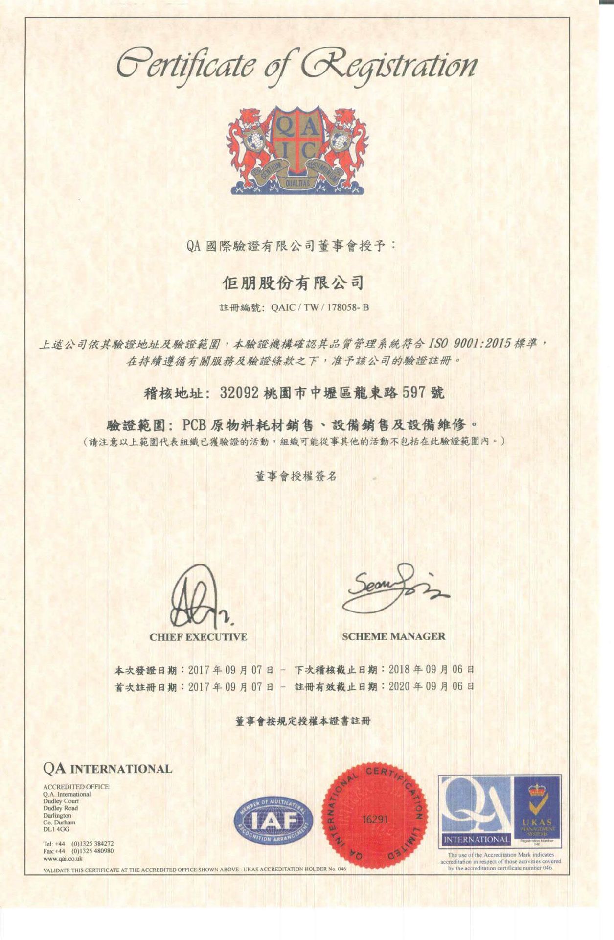 在領導力企管專業顧問輔導下,佢朋股份有限公司已順利完成 ISO 9001:2015 品質管理系統(ISO 9001:2015 Quality Management Systems)教育訓練(Training)、系統建置(Implementing)、外部稽核驗證 (Certification)3大實施流程,並且榮獲 QA頒發 ISO 9001:2015 品質管理系統新版證書。
